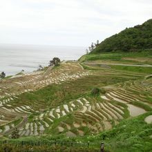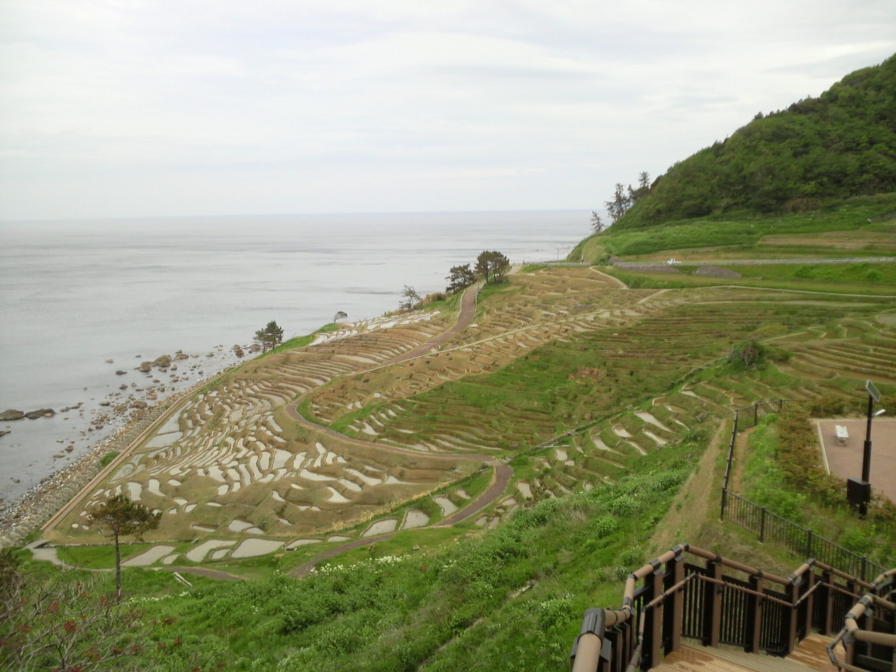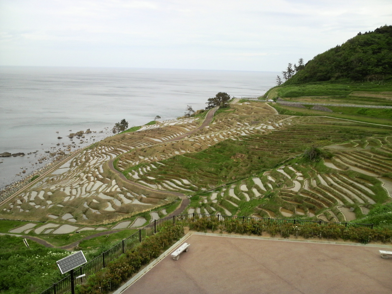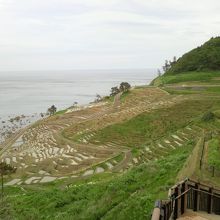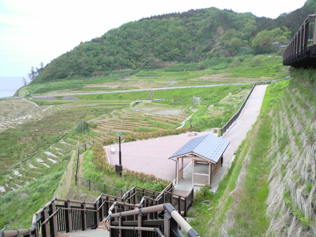 日本海に面した傾斜地に小さな水田が並んでいます。集落のある山側より、ここのほうが日当たりも水の便もよかったのでしょうか。良くこんなところを切り開いたものだと、棚田を見るたびに思います。ポケットパークも新しくきれいになっていましたし、千枚田に通じるスロープも作られていました。