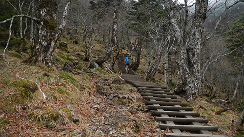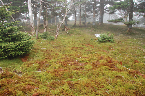 残念ながらガスに包まれ大峰山縦走路の峰々を見ることはかないませんでしたが、さすが雨の多い大峰山系で弥山付近の苔むした雰囲気は神秘的でした。