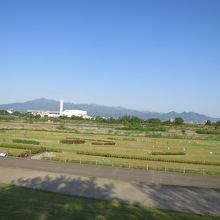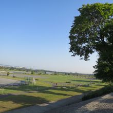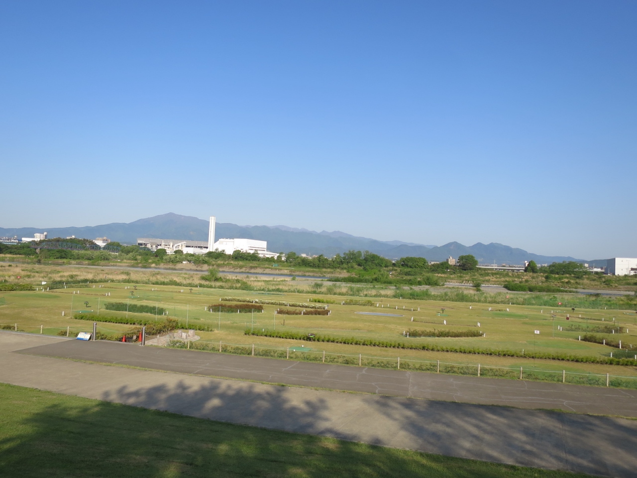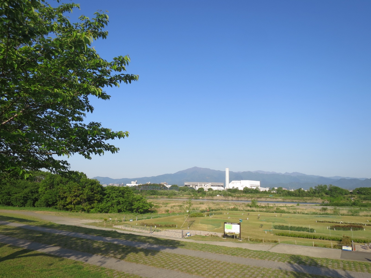 相模川の広い河川敷にグラウンド、野球場、パークゴルフ場などが整備されています。公園内の土手の上から眺めると、西側が大きく開けていて、大山、丹沢の山並みが見渡せます。