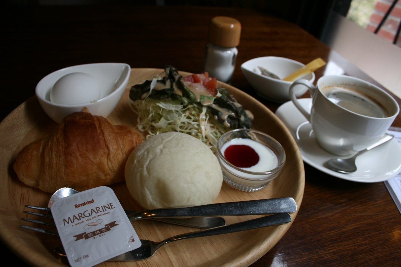 コーヒーには、サラダ・ゆで卵・レン窯パン(レンガの窯で焼いたパン)がつきます。