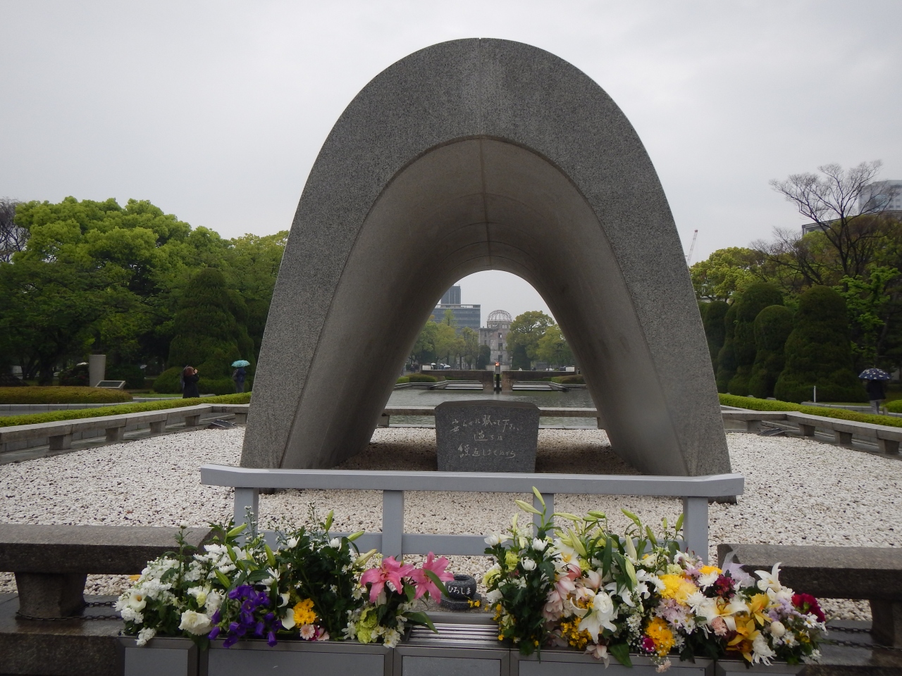 原爆ドーム・平和祈念資料館・平和の灯と一直線上になるよう丹下健三が設計した慰霊碑です。真正面に建てば、碑のアイストップが原爆ドームになっています。2015年4月、欧米系外国人のツアーがひっきりなしに訪れてました。