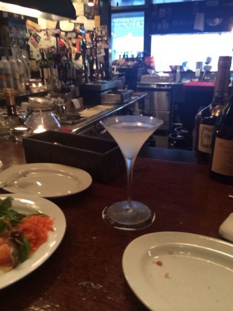 小さいですが、雰囲気のあるバーです。コリドー通りに入ってすぐにあります。カウンターなので、デートにもってこいです。筍の生ハムフリットと厚切りサーモンのマリネとお酒を飲みました。マリネはサーモンを自分で切って温泉卵をかけて食べました。美味しいかったです。注文後すぐにでてくるのもよいです。