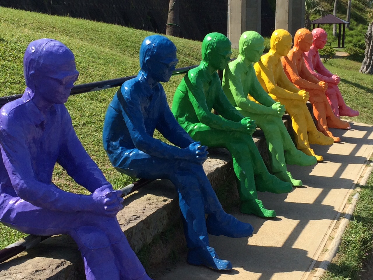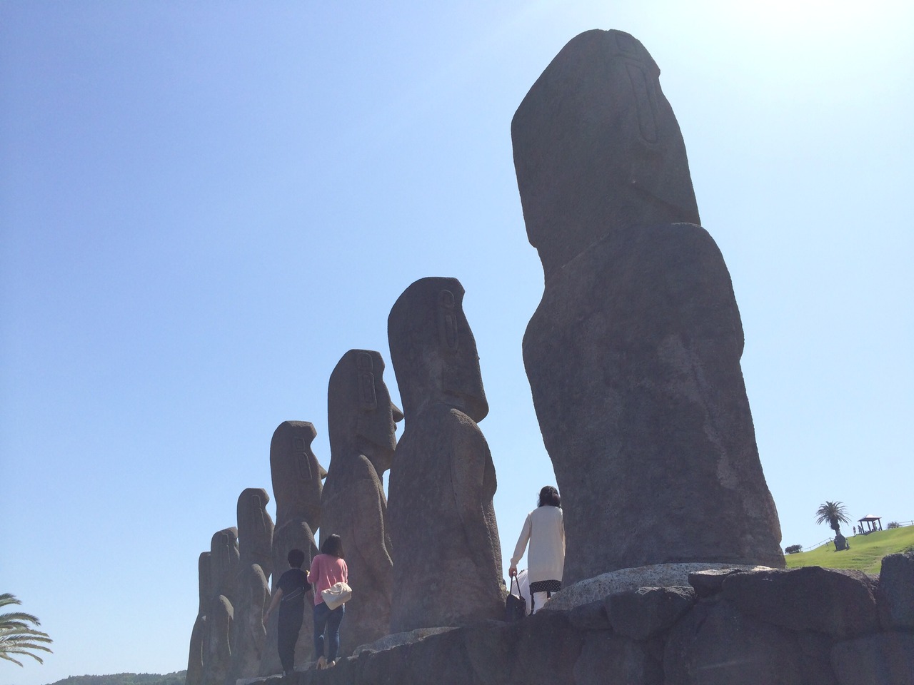 まずは、モアイ岬広場へ。7体のモアイ像たちと再会しました。なんとなく痛んできたかな、って印象ですが、相変わらず、でかかったです。しかも青空に映えます。芝生は、人工芝に変わってました。
