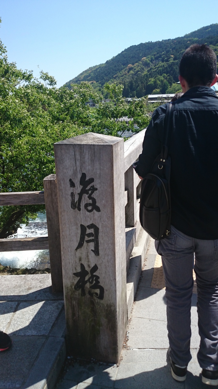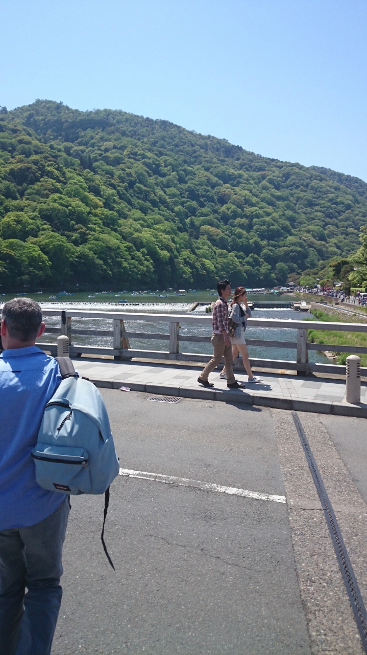 嵐山と言えば渡月橋。何度も行っているので珍しくはないが橋から見る景色は天気のいい日には特に絶景。今回はてこぎボートで一杯だった。ボートに乗ったり、保津川下りから写す景色の方が個人的には好き。人が多いので記念撮影もいまいちといった感じ。