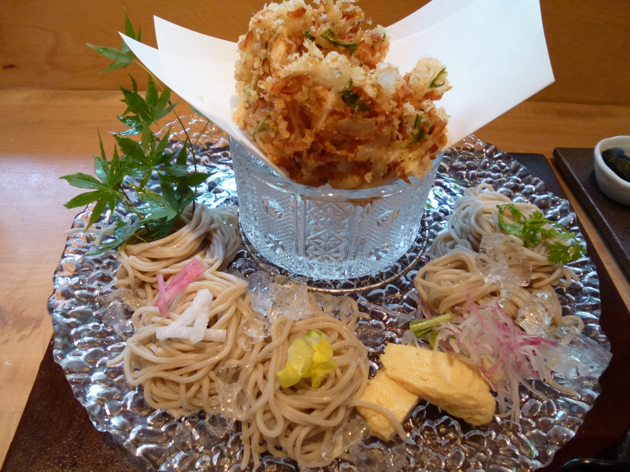 ガラスの器にそばが盛られ、かき揚げは別に提供されます。