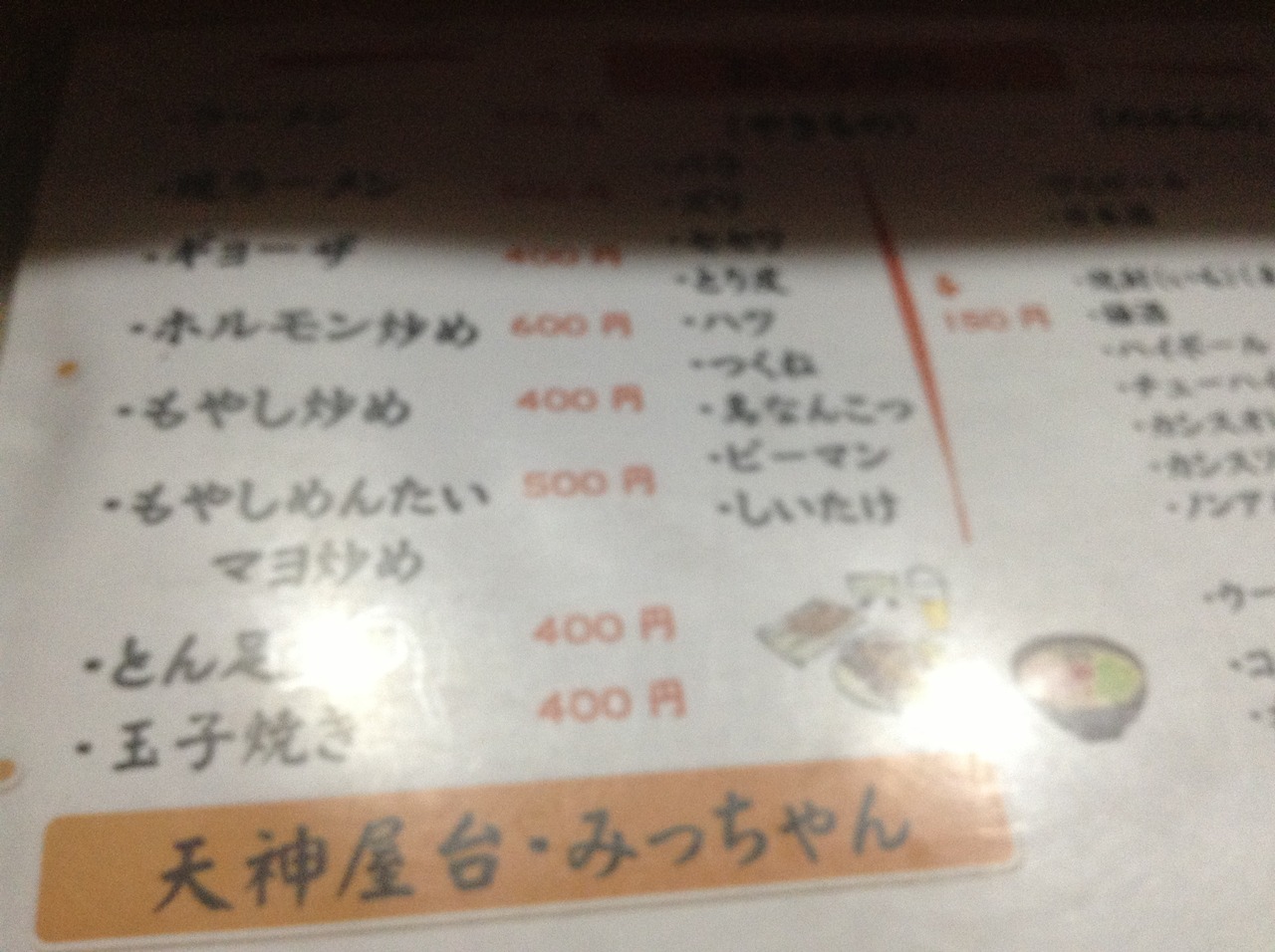 光ちゃん(みっちゃん)は天神のど真ん中天神交差点にある屋台です。天神駅からすぐなので帰りは便利です。親富孝通りでラーメンを食べた帰りに立ち寄りました。