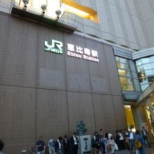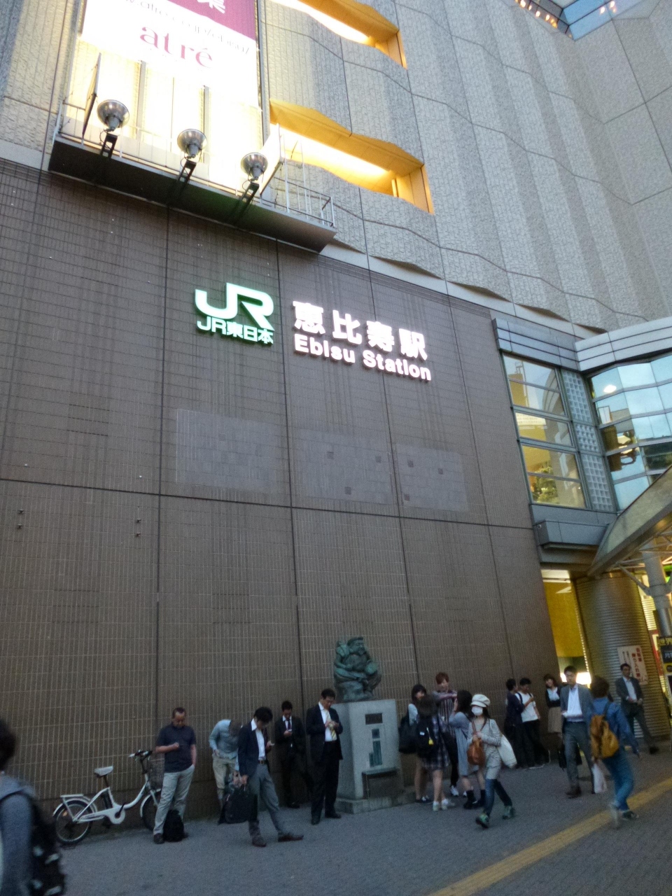 恵比寿での食事の際、日比谷線の出口を出ると、恵比寿像の前にたくさんの人がいました。渋谷のハチ公ほどの有名スポットではありませんが、こちらも待ち合わせスポットになっているようです。雨の日は別の場所を選んだ方が良いかもしれません。