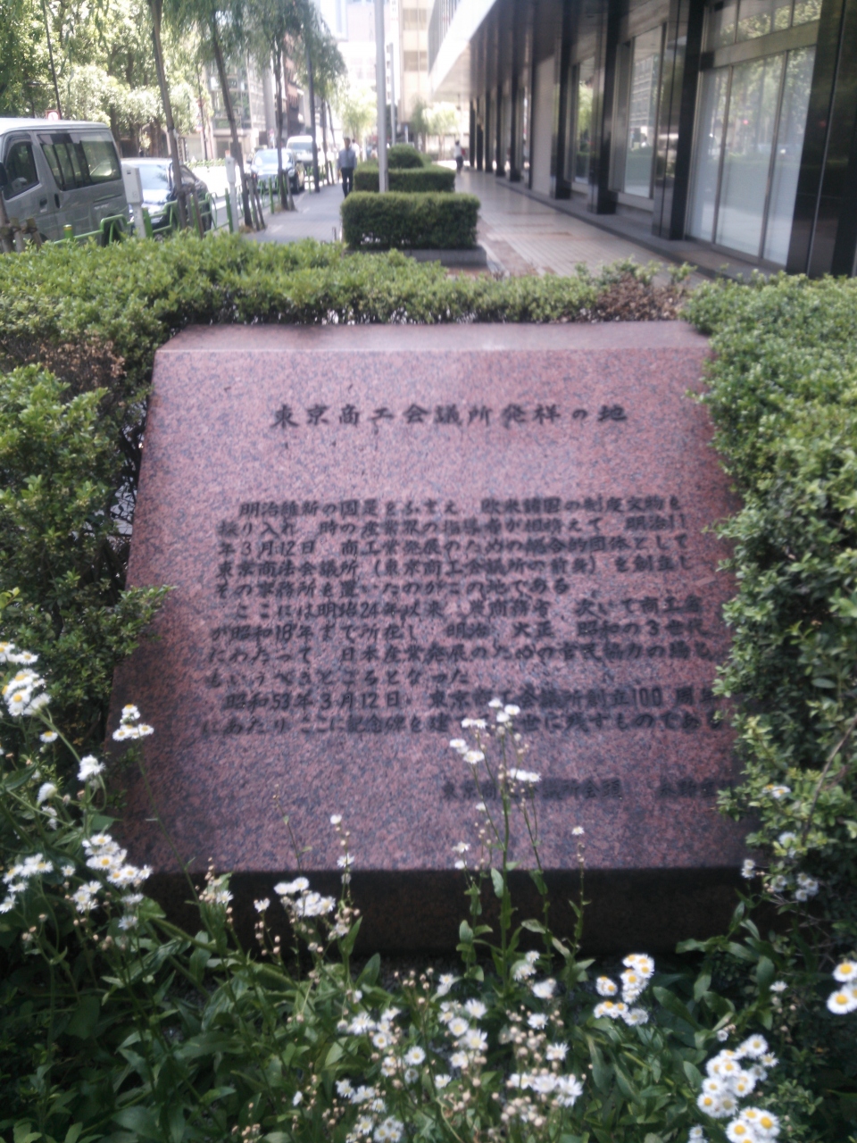 植え込みにあり、よく探さないと見つかりません。築地の采女橋手前の銀座6丁目スクエア、昔の日産本社ビルの入り口右手の植え込みにあります現在の商工会議所は丸の内にあり、再開発が行われています。明治時代の富国強兵などの歴史があります