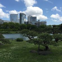 中国風と言われれば確かにそう見えなくもないですが、周囲が和風庭園なので、それになじんでいるせいか、ふつうの渡り通路のような感じでしたが、全体との調和が見事で、背景の高層ビルも景観を損ねるというよりはむしろ借景として面白い対比になっていました。