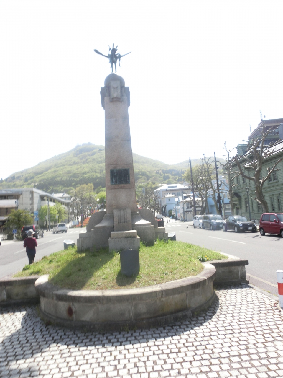 坂道の港よりに、明治天皇の函館入りを記念した塔がある。