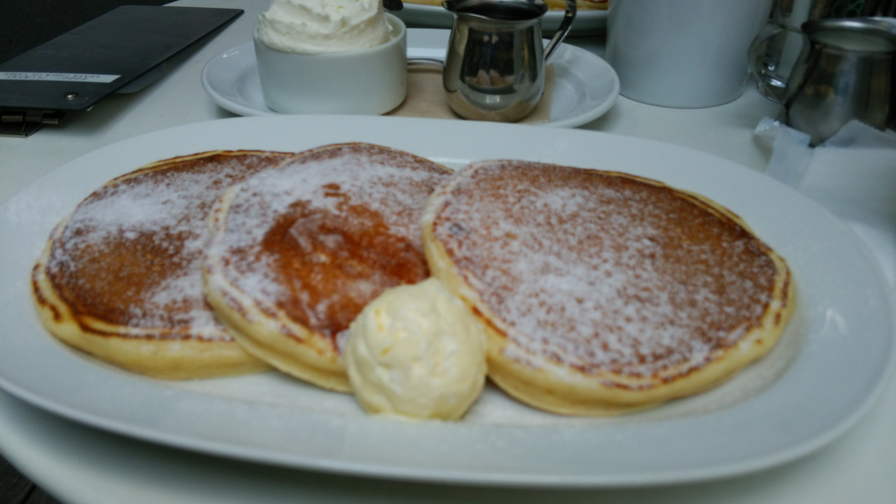フワフワ食感のパンケーキ。朝から三枚は少しキツいです。