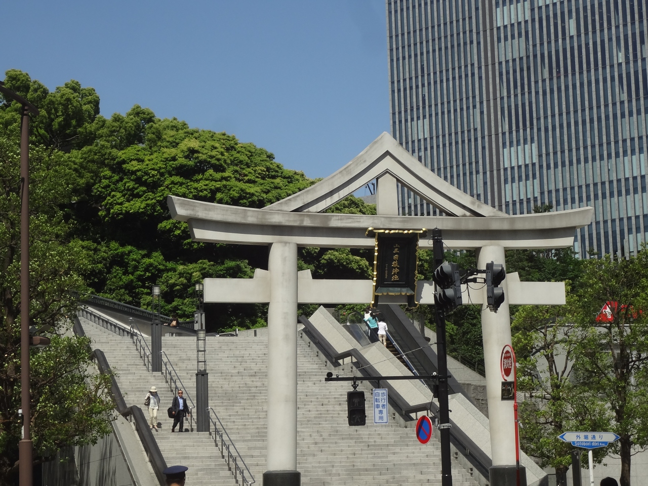 近隣はビジネス街。山王パークタワーや赤坂Bizタワー、赤坂アークヒルズも徒歩圏内です。そんな中にあるのでビジネスマンの参拝客多数です。特に正月明けはそのビジネスマン達の初詣姿をよく見かけます。いつくかの入口がありますが、やはり山王パークタワーの横からエスカレーターで上がるところが一番目立ちます。大きな鳥居と宝塚のような大階段が圧巻です。境内はその上がったところにあります。思いのほか立派でした。