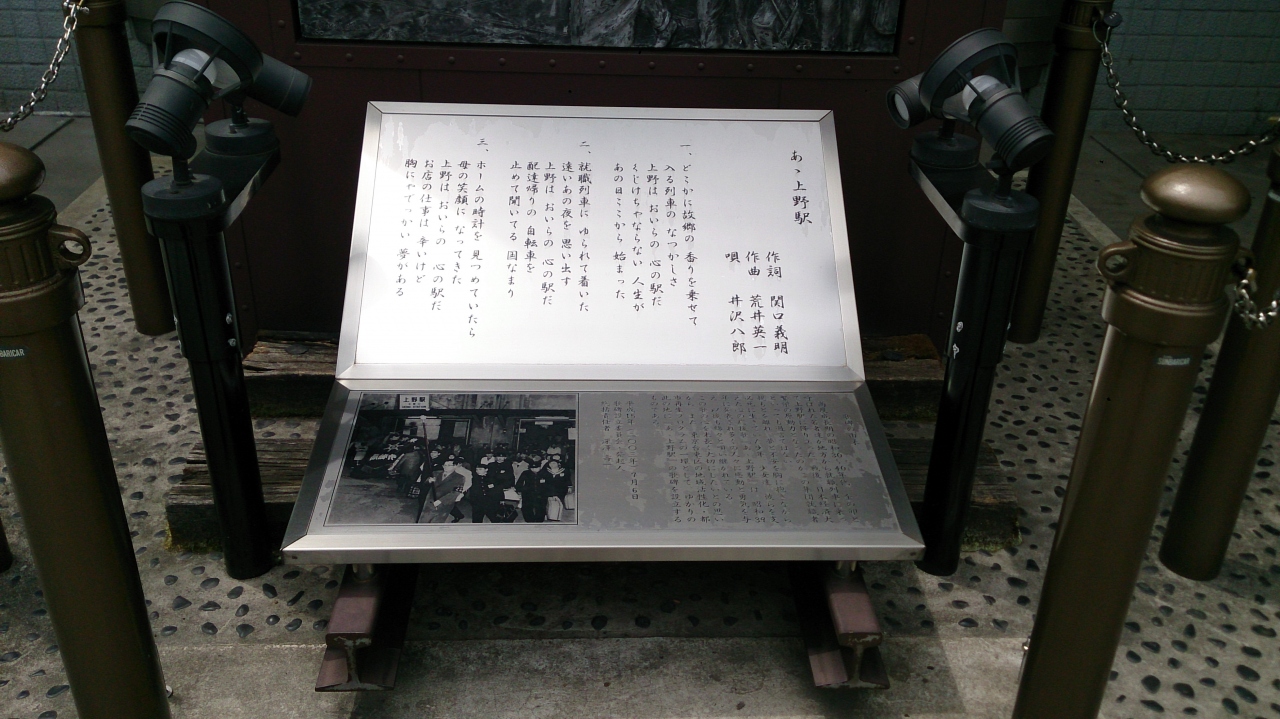 上野駅広小路口の真ん前の超一等地にあって、意外に大きいのでびっくりしました。この場所は何百回と通っていましたが、気にしていなかったので、そう言えば、なんかあったな~。程度の認識でしたが、あらためて行ってみて、台座があってチェーンの策で仕切られ、人の背丈以上の長方形の歌碑のプレートで、結構見応えがあります。歌碑の前にあゝ上野駅の歌詞とこの歌のヒットした頃の集団就職の風景の写真が説明板として設置され、集団就職などを教科書でしか知らない世代の人でもわかるようになっているのが非常に良いです。また、この歌碑のすぐ脇が上野駅の広小路口の駅舎で、この歌の時代から変わらぬ姿で建っており、絶妙です。絶妙な場所に歌碑を作ったわけですが。