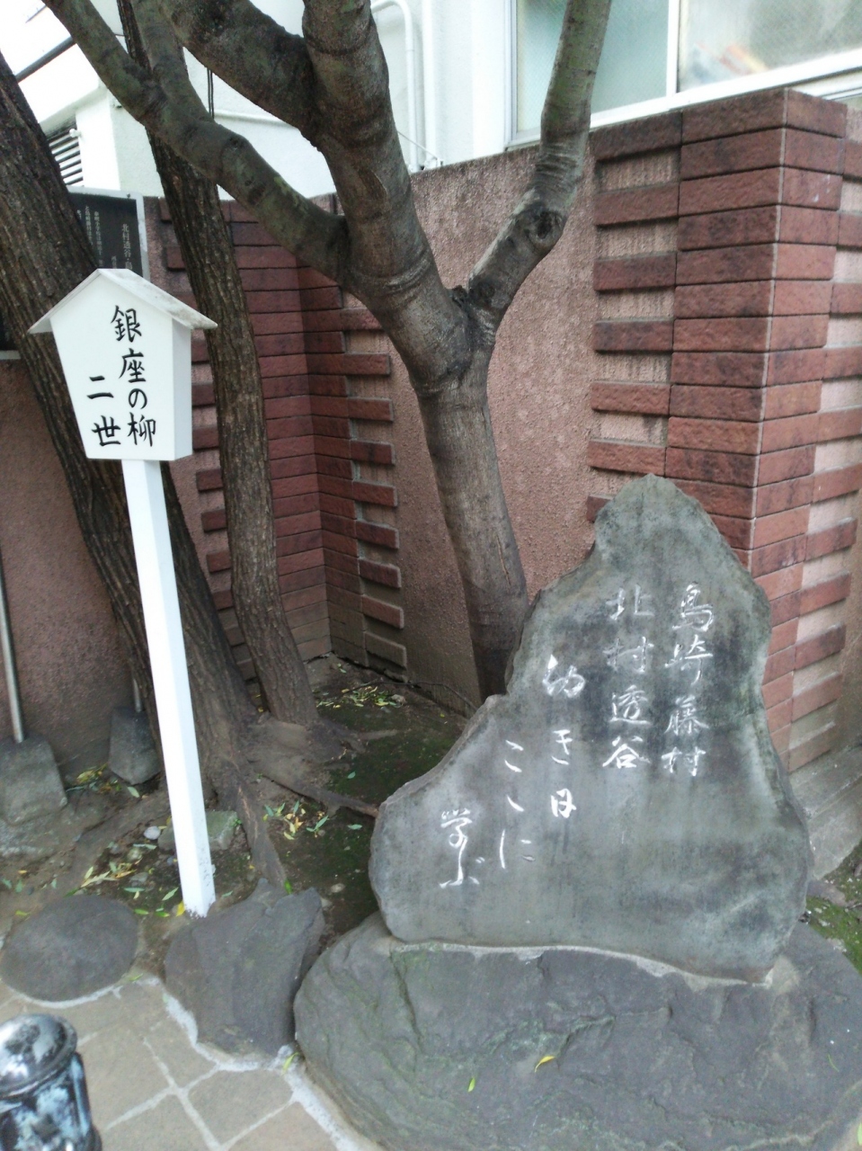 銀座、数寄屋橋近くにある泰明小学校の前にありました。かなり注意して歩かないと素通りしてしまうような場所にあります。この銀座の柳二世のすぐ横には島崎藤村や北村透谷の石碑もありますが、こちらも注意していないと素通りしてしまいます。