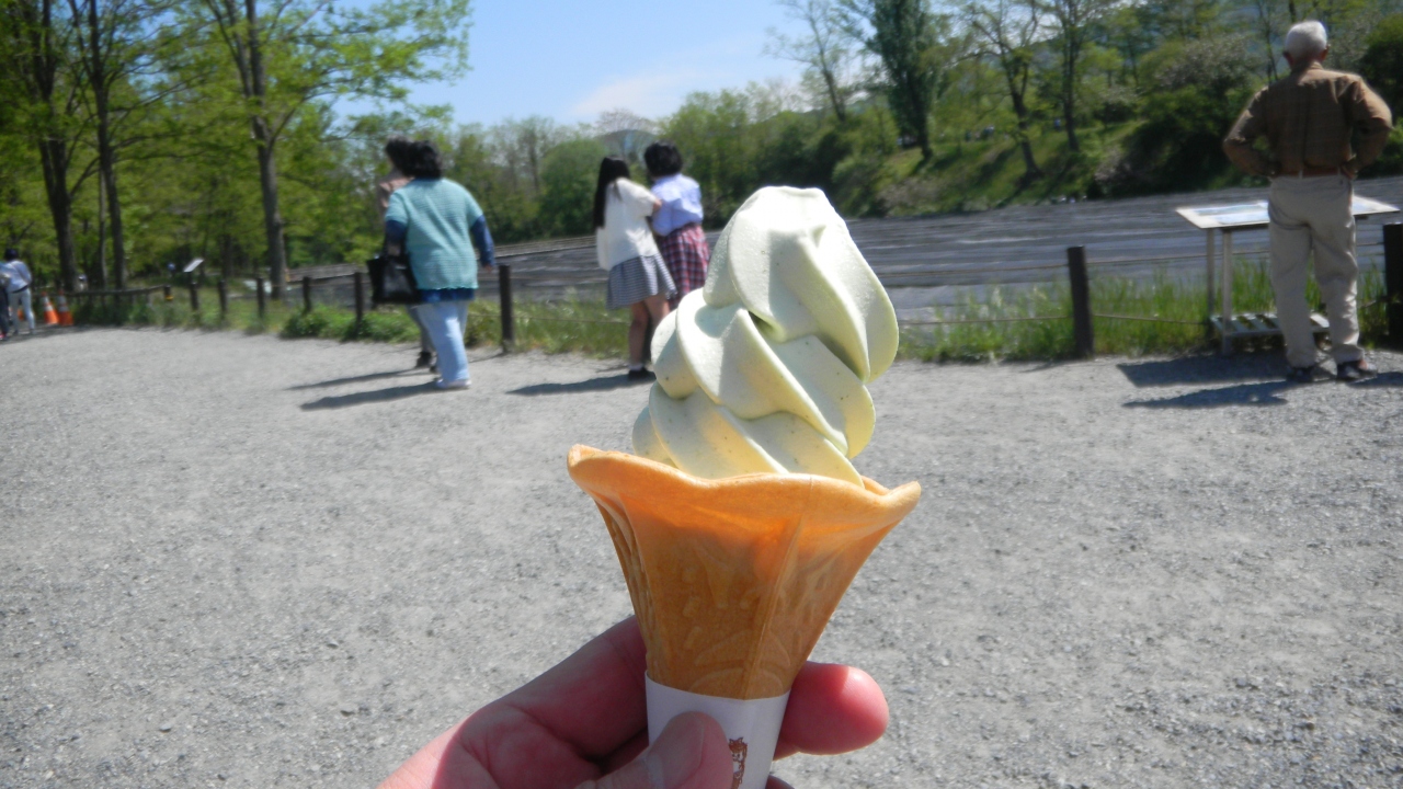 HPからわさびソフトクリームの割引券をプリントアウトして行くと、360が300円になります。薄緑色できれいです。ぜんぜん辛くないので、お子様でも大丈夫。