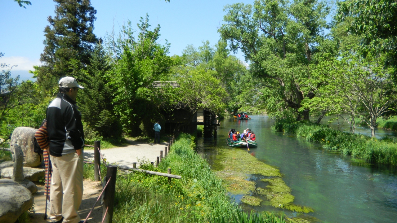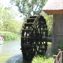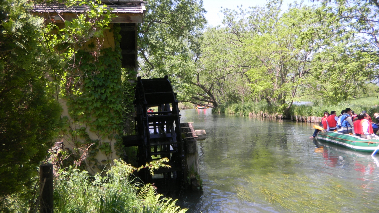 三連水車があり、風情もあります。その川をボートで水上散歩できます。GWや夏休みは20分1200円、こども900円です。たいへん混んでいたので、残念ながら今回は乗れませんでした。