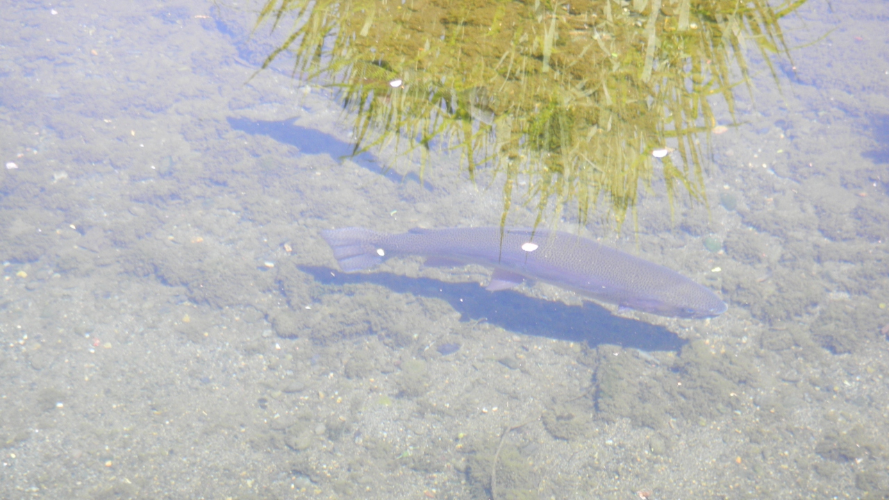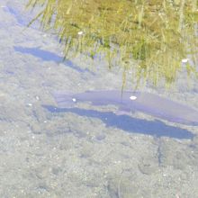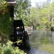 駐車場すぐの第一売店横には湧水川があり、透き通った川の中の水草が揺らいでいます。