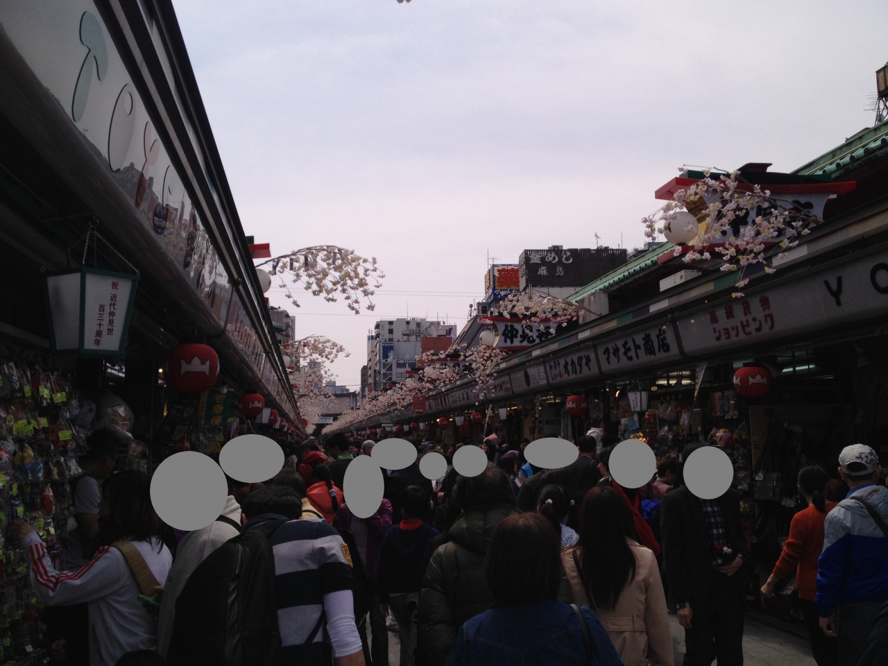 浅草の観光名所である仲見世通り。日本らしいお土産物や甘味などのお店が軒を並べています。日曜日はたくさんの人でごったがえしていました。外国人観光客がとても多く、いろんな国の言葉が飛び交っていました・笑。