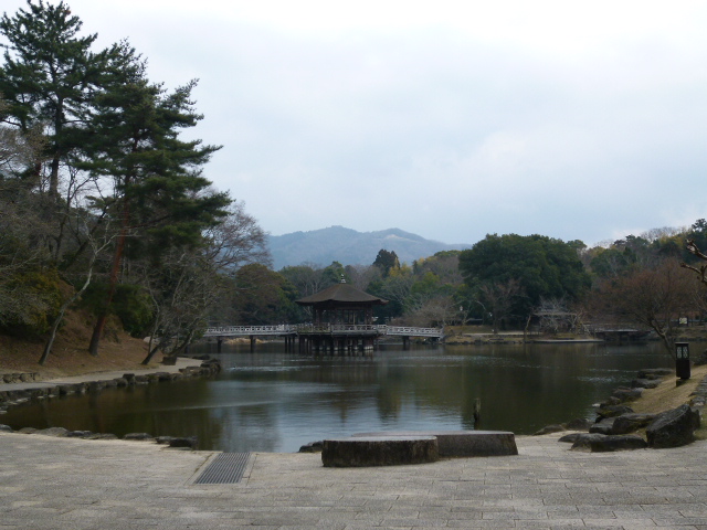 鹿で有名な奈良公園に来ています。今日は奈良観光です。この辺には荒池などちょっとした池があります。ここ「浮見堂」は鷺池の中央付近にあり、遊歩道も設置され歩きやすくなっています。ここは奈良公園でも端ですが鹿がここまで来ていますね。風情がありますよ。公園の中心部からちょっと離れていますが是非立ち寄ってくださいね。