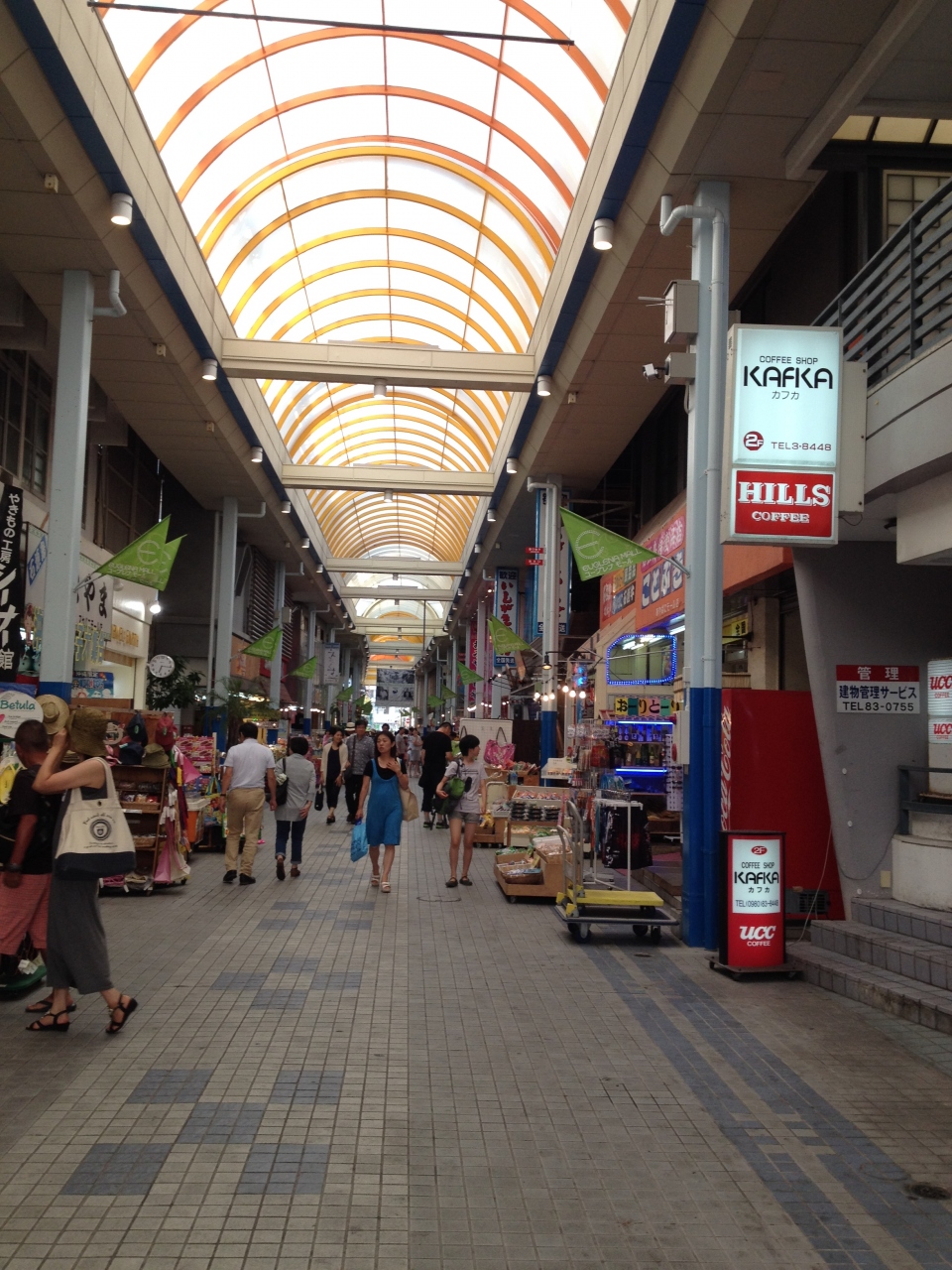 石垣島の中心地に来るとまずはここに向かう商店街です。離島ターミナルからも徒歩圏内なので、離島に行く前に時間を潰すにも良いでしょう。おみやげ物屋さんがメインですが、石垣のフルーツを売る露店も並んでいます。