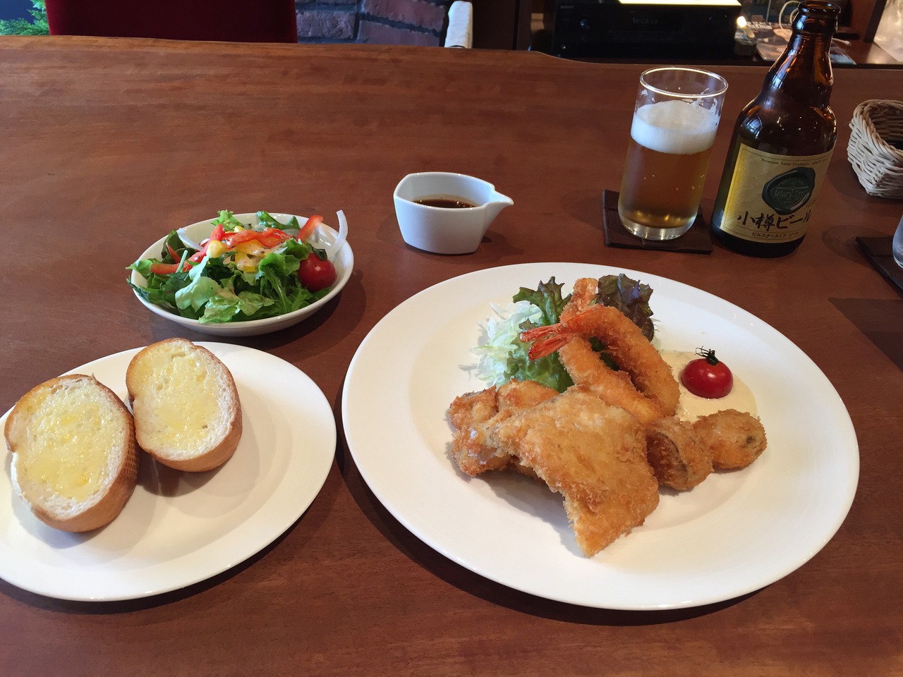 800Yen台のミックスフライですが、ミックスフライ(エビフライx2尾、ホタテフライx2、白身魚フライx2)、付け合せキャベツのサラダ、別皿サラダ、パンorライス、ドリンク付きでパフォーマンスの良さに感動。しかも美味しい