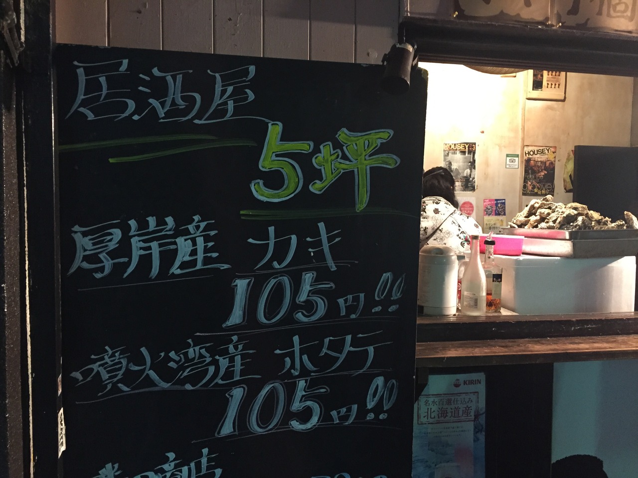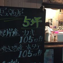 居酒屋5坪最高です。生牡蠣、焼き牡蠣とも105yenと超リーズナブルですです。通りかかり、105yenなので期待もせず注文しましたが、築地で観光客相手の300-500yenの生牡蠣販売より全然良い牡蠣でした。しかも美味しい、生牡蠣2つ焼き牡蠣2つを注文しましたが、さらに2つサービス余計にサービスしてくれました。しあわせ❤?