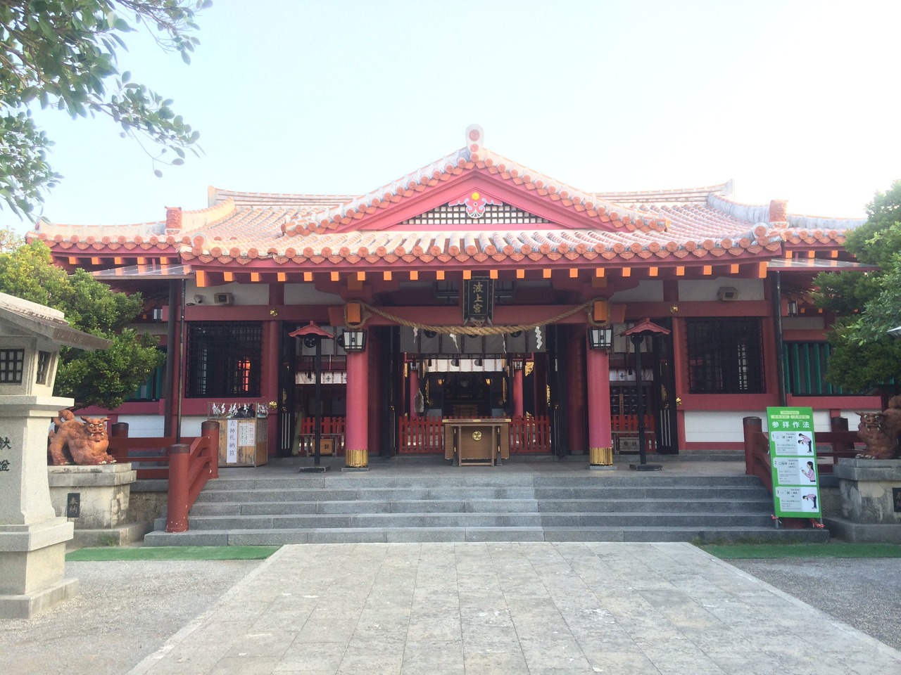 県庁前から徒歩15分位の所にある琉球八社の最上位の神社で、「なんみんさん」と呼ばれています。主祭神はイザナミノミコトなど。がけの上にあるこじんまりとした神社ですが、真っ赤なお社が首里城を思わせ、沖縄の空にとても似合っていました。結婚式もできるようです。