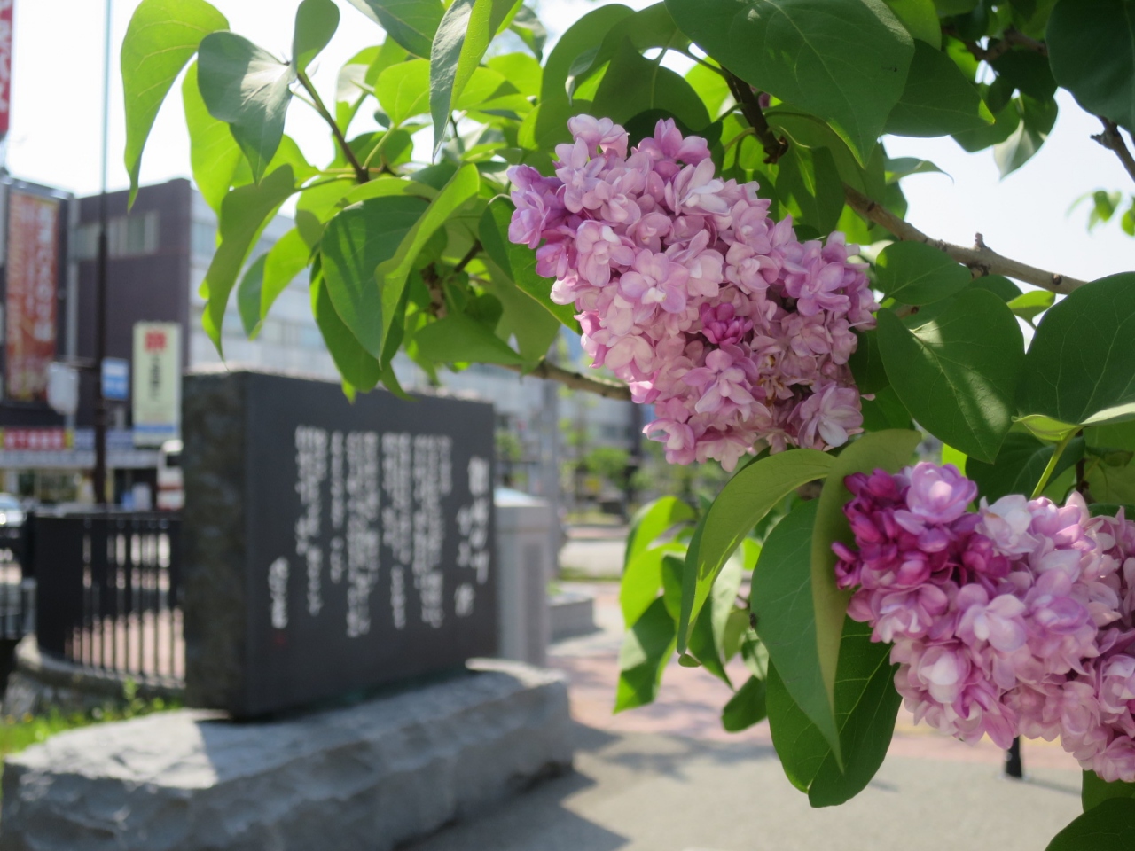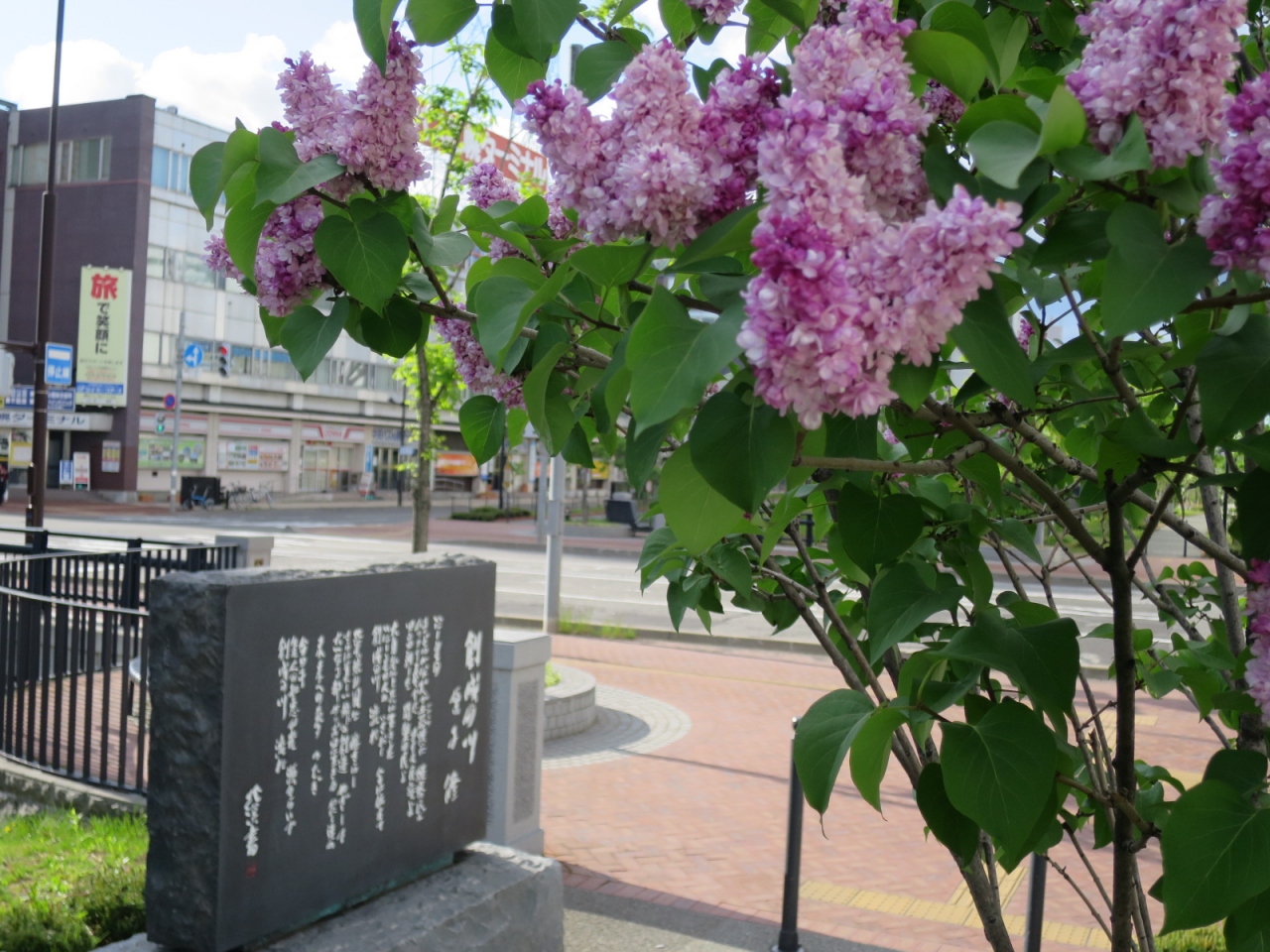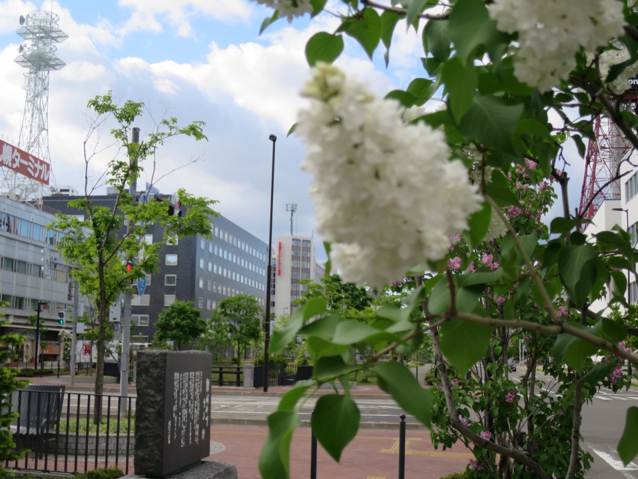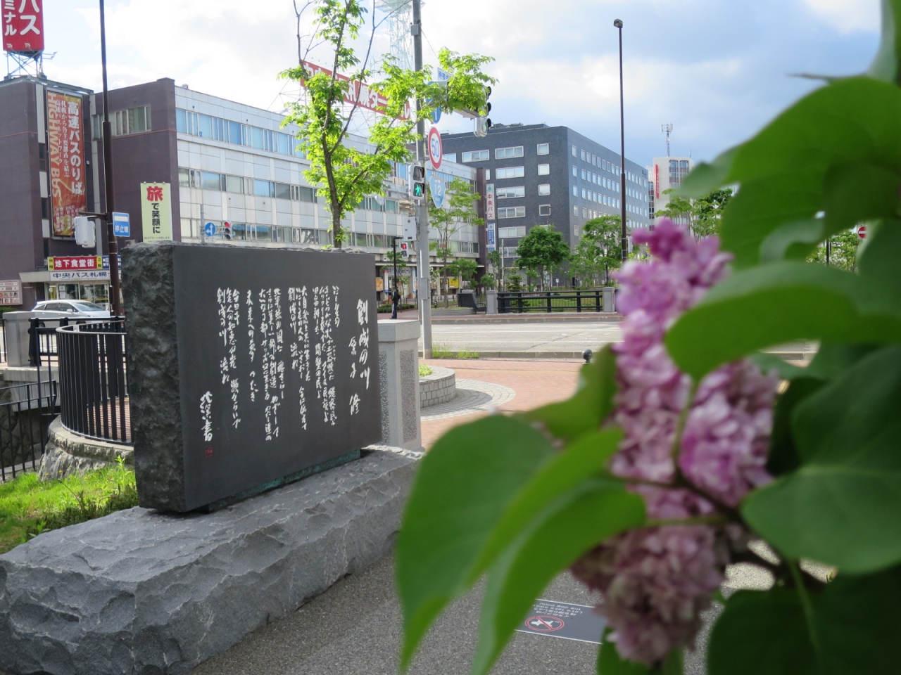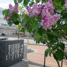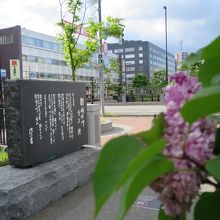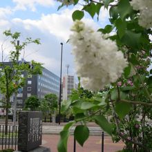 創成川沿いは創成川公園として2011年に整備され、碑もそれに伴い建立されたようです。公園にはそのほかアート作品や水辺に下りられる場所があり、草花、特にライラックが多く植えられています。5月下旬ころ(2015年は開花が早く中旬ころ)が見頃で、碑の近くにもライラックがあり、よい香りを漂わせていました。ただ、まだ花の少ない若木が多く、大通公園の方が見応えがあります。
