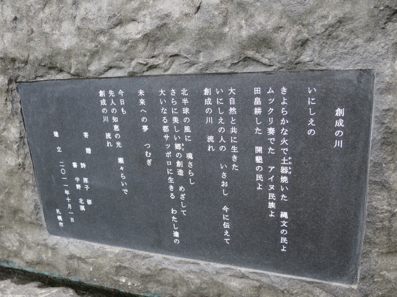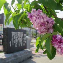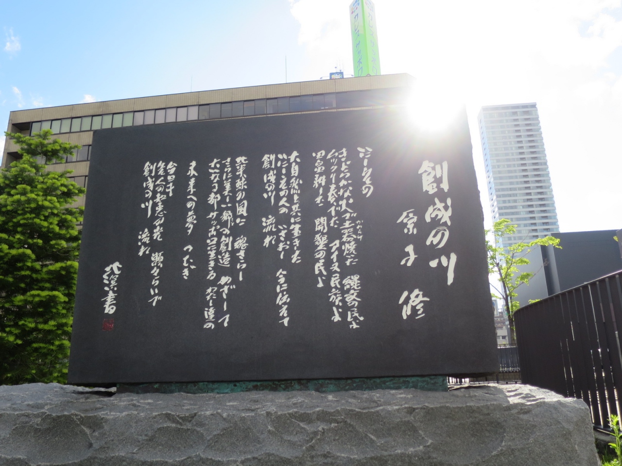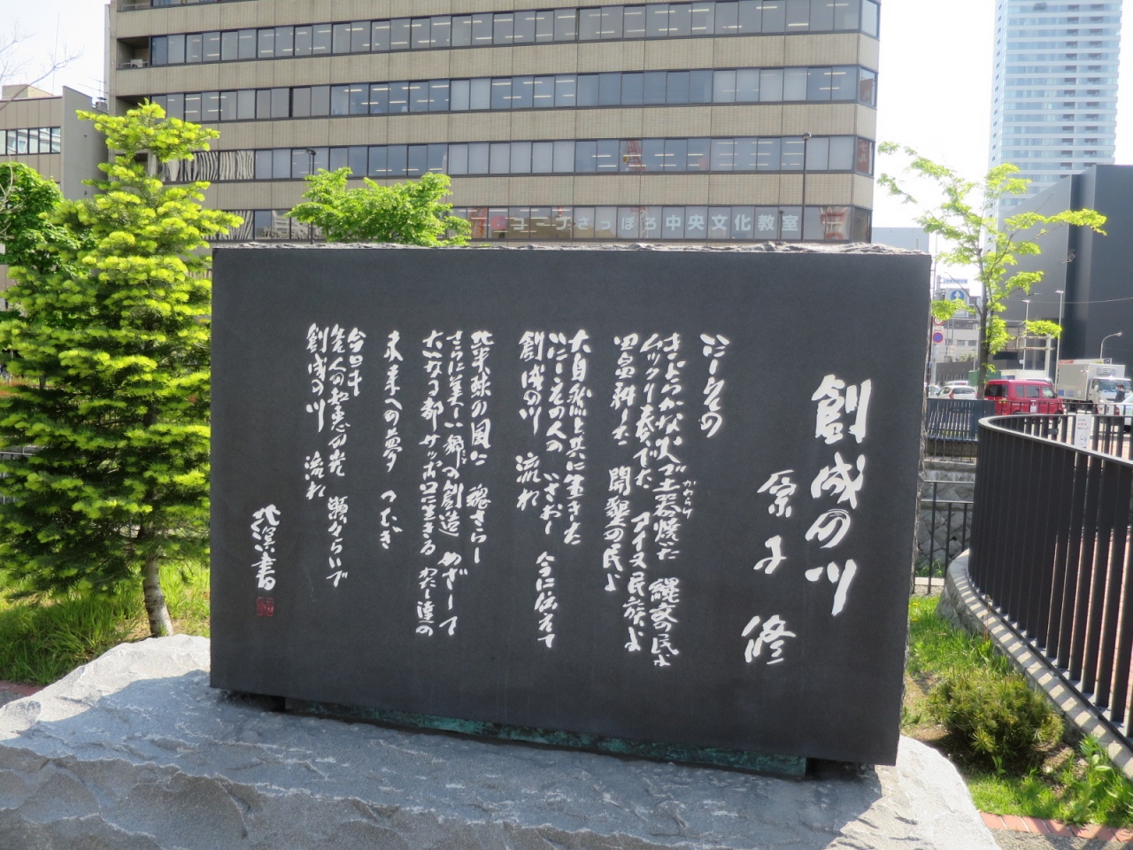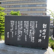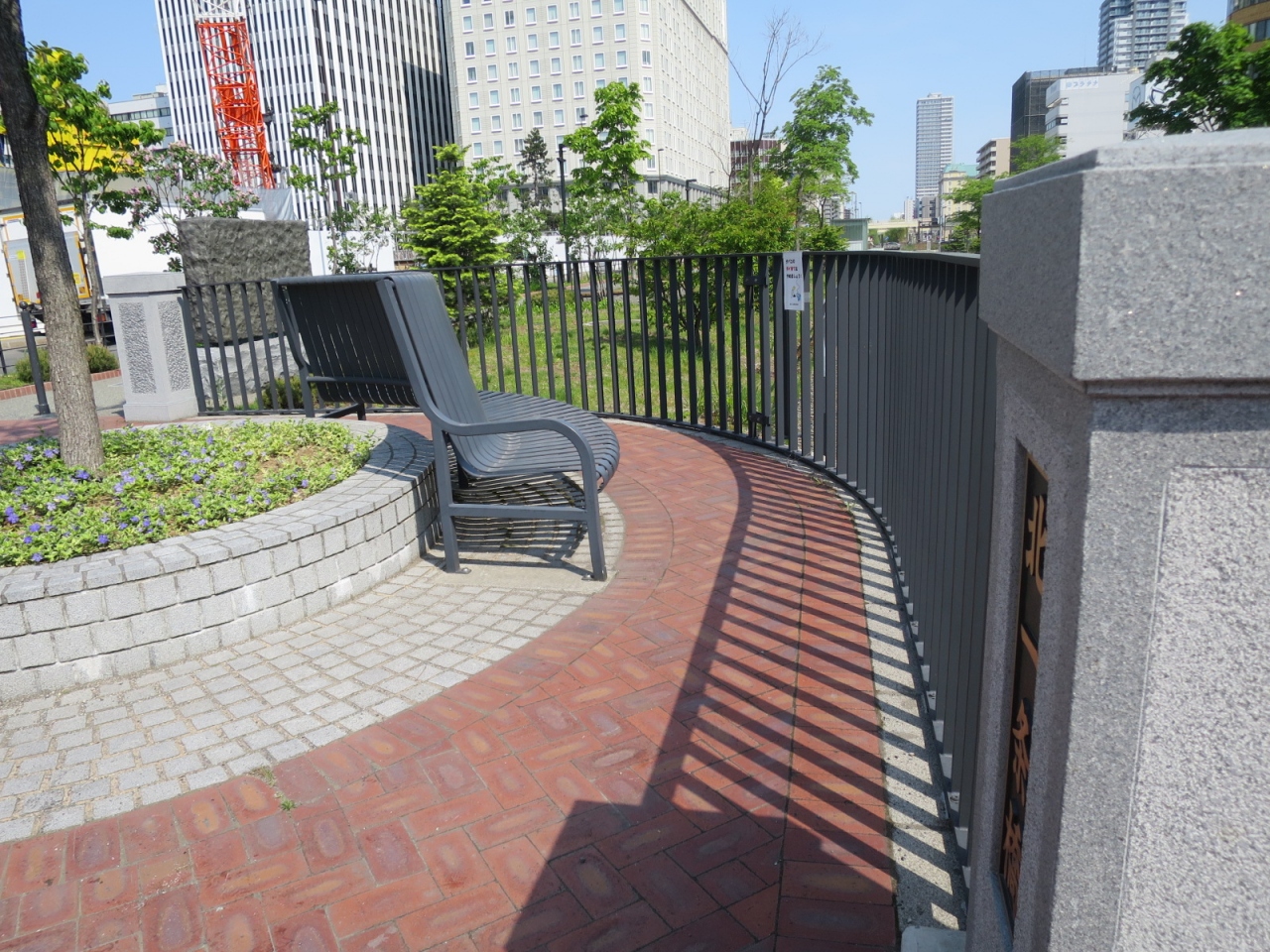 創成川沿いは創成川公園として2011年に整備され、碑もそれに伴い建立されたようです。公園にはそのほかアート作品や水辺に下りられる場所があり、草花、特にライラックが多く植えられています。5月下旬ころ(2015年は開花が早く中旬ころ)が見頃で、碑の近くにもライラックがあり、よい香りを漂わせていました。ただ、まだ花の少ない若木が多く、大通公園の方が見応えがあります。
