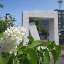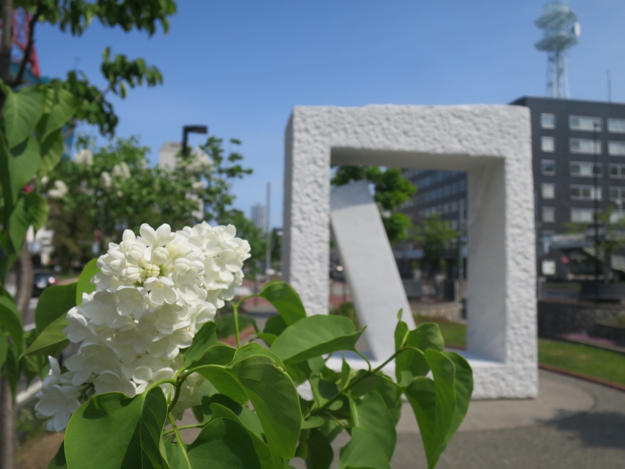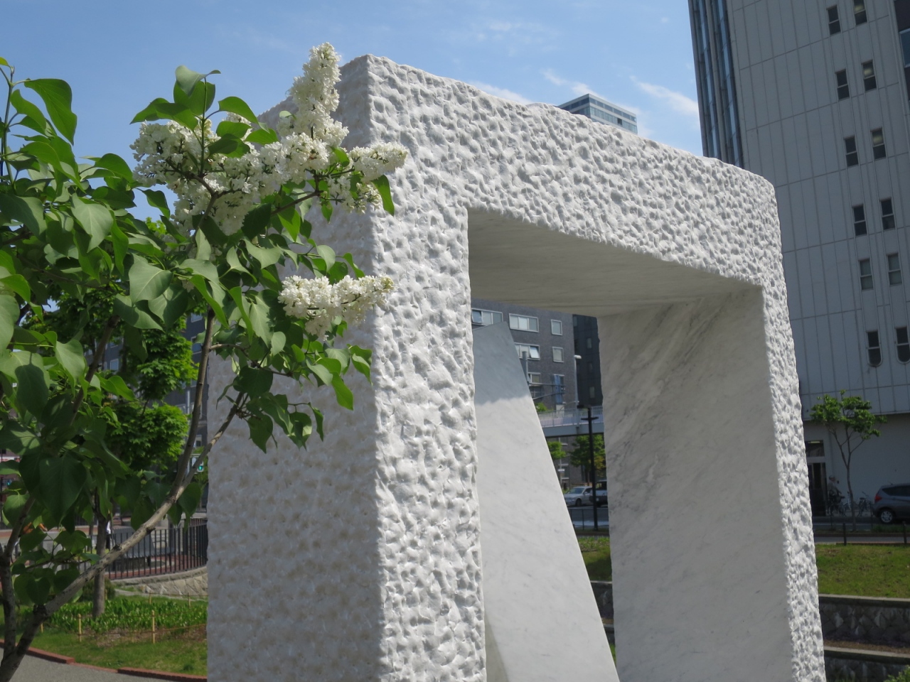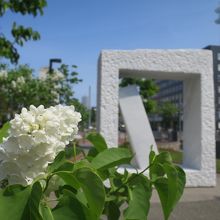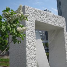 白色のモニュメントで、晴れた日は白く輝いてきれいです。隣には同じく白花のライラックが植えられ、よくマッチしていました。5月下旬ころ(2015年は開花が早く中旬ころ)が開花期です。
