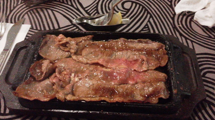 値段は安くはないが、なかなか良い肉が2枚、ステーキと言えないのではないか・・・という程度に薄くスライスされ、焼かれて運ばれてきた。