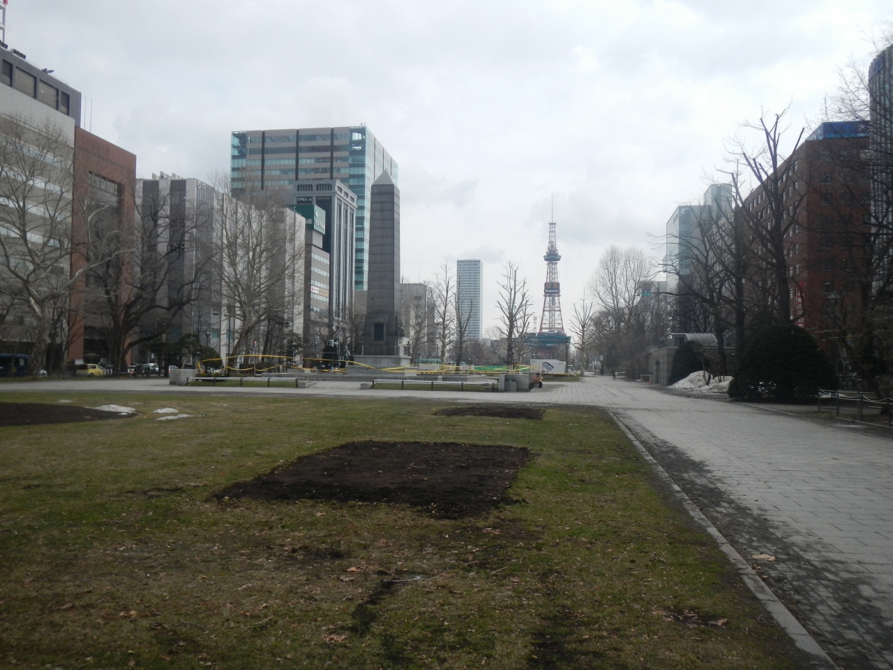 宿から札幌駅に行く途中で横断した。4月1日という時期は、雪祭りの跡はすっかり片づけられ、残雪がわずかにある程度だが、花に時期にはまだ早く、人影もまばらだ。5月の半ばになれば桜が開花し、花を楽しむことができるだろう。