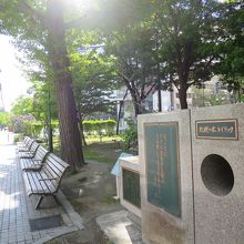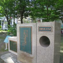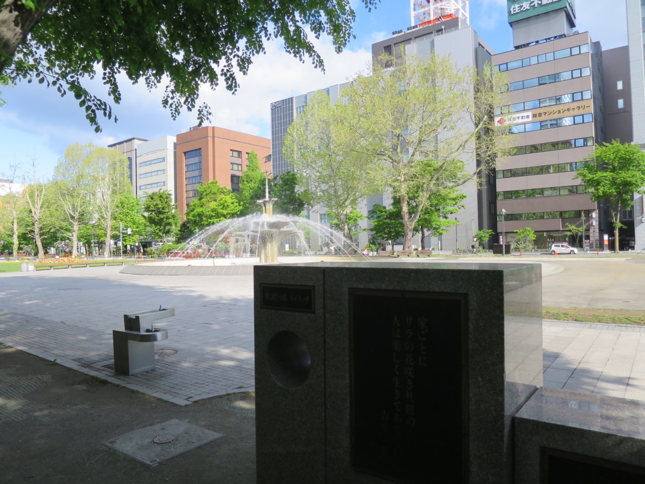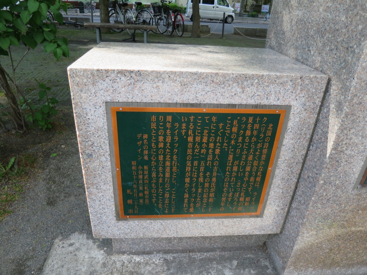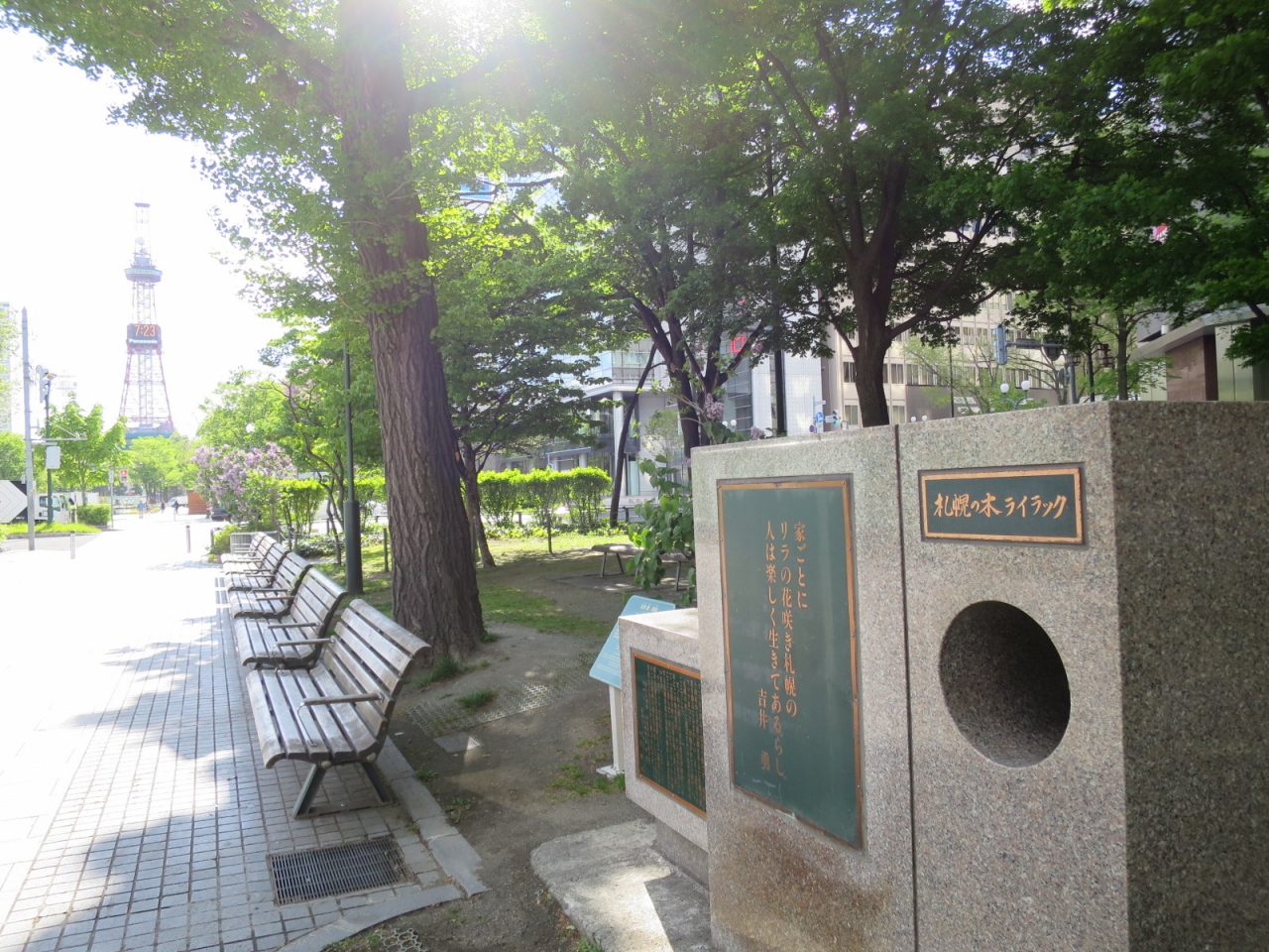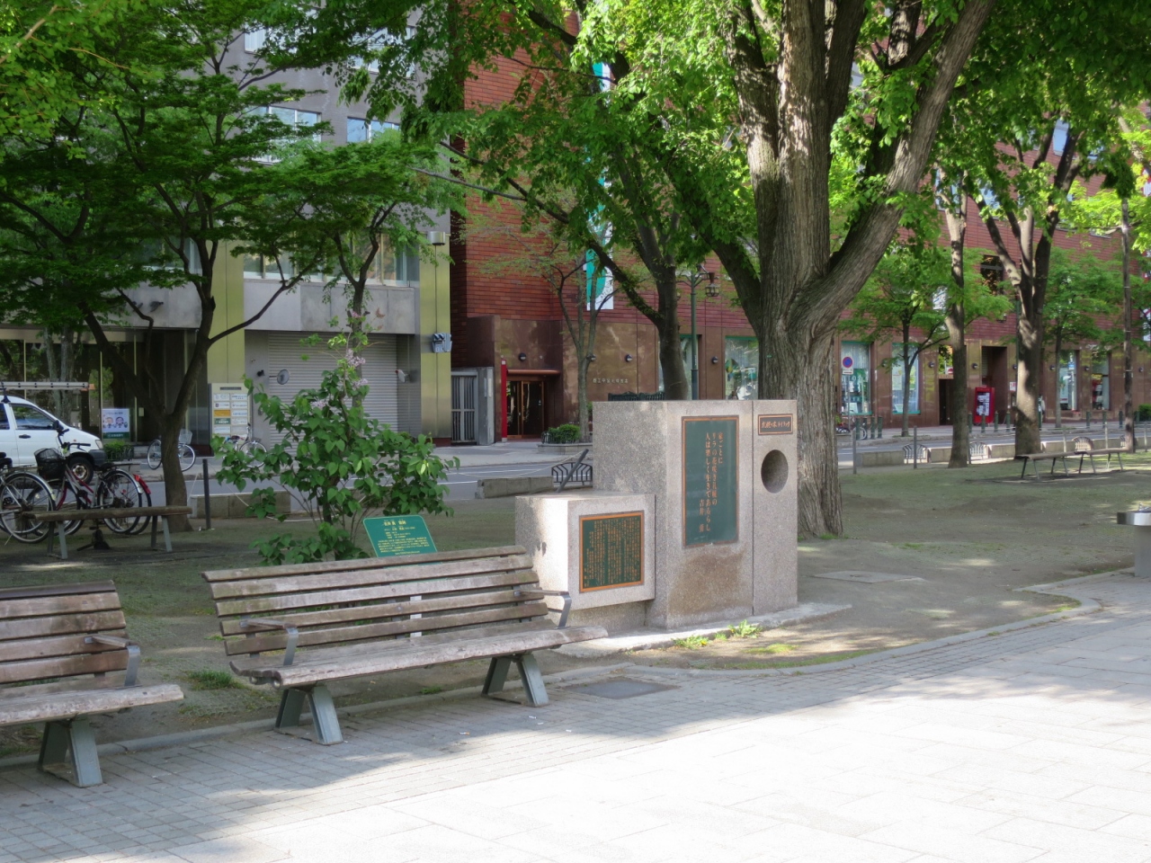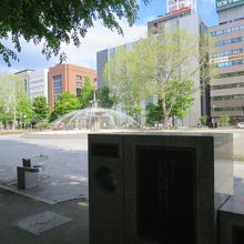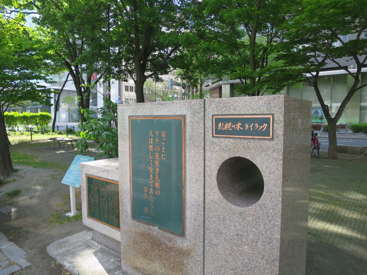 大通公園4丁目の南側にあります。周囲の木々に葉がある時期は日陰になり、碑の高さもそれほどでないため、目立ちません。裏手にある北海道銀行が創立30周年を記念して1981年に寄贈したと解説板に書かれています。