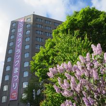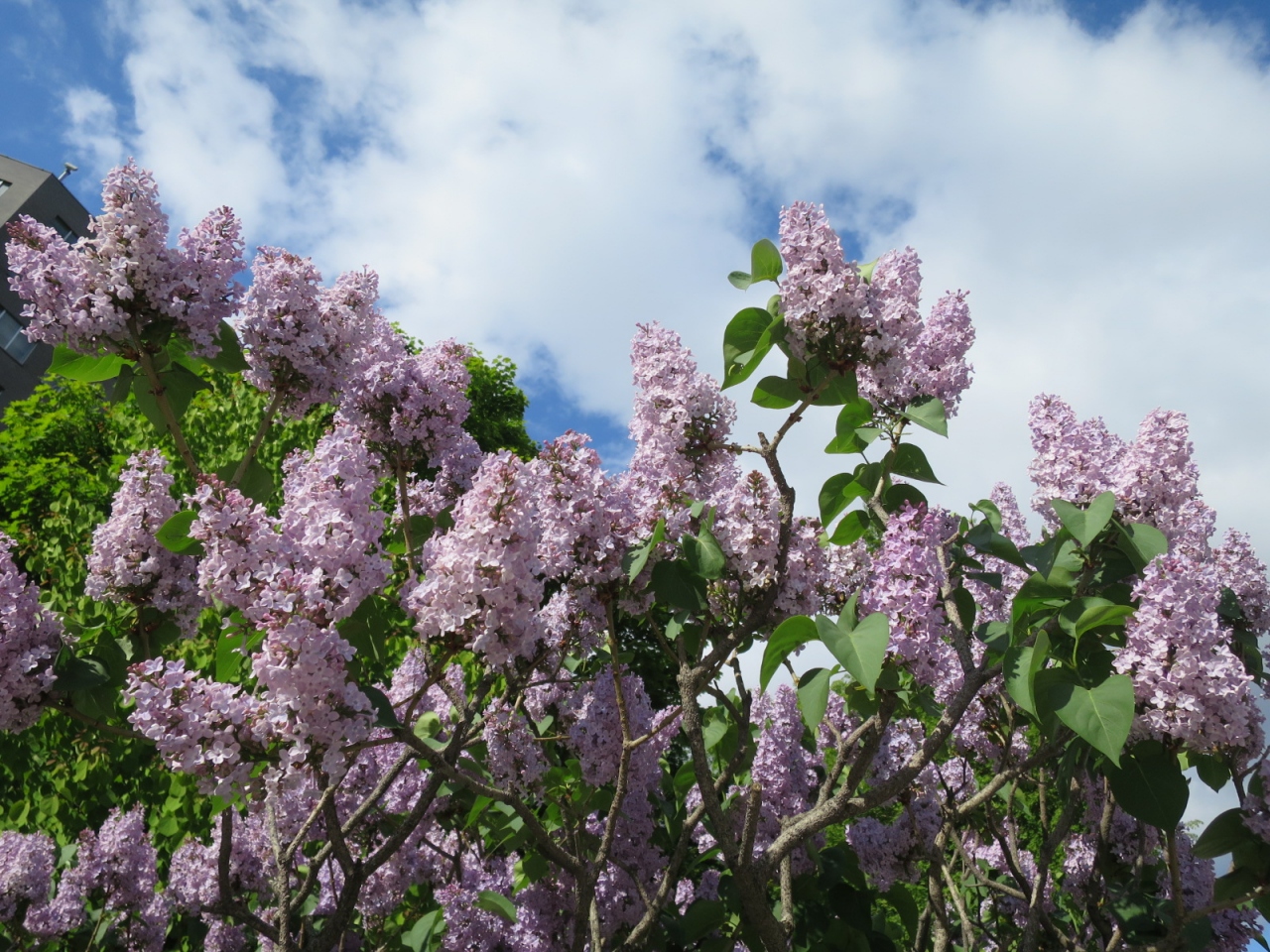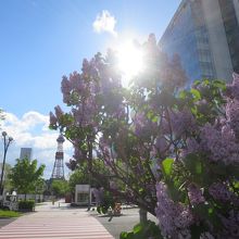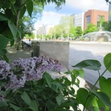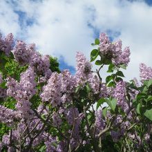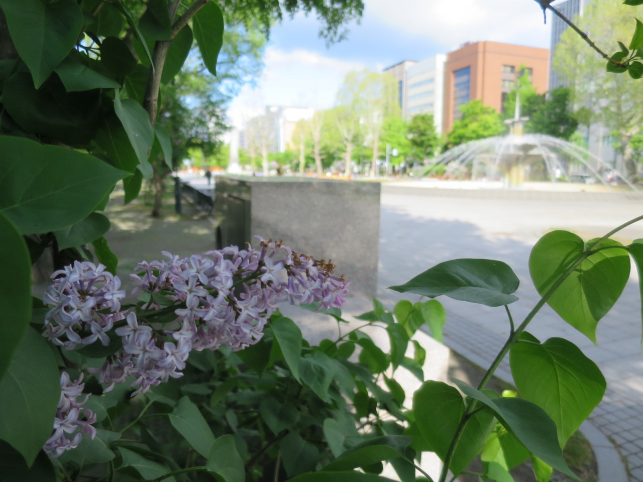 ライラックの見頃は例年5月中・下旬です。碑のある大通公園は札幌市のライラックの名所の一つで、あちらこちらで美しい花が見られ、良い香りが漂います。ただ、碑の隣のライラックは若木のせいか、日陰のせいか、今ひとつ花付きが悪かったです。
