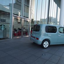 すぐ近くに日産の最新カーが並べられて、その横でコーヒーを飲めます。ガラス張りの店内の向こうには小さいけれど川があってリバーサイドになっています。外のテラスっぽいところでくつろぐこともできるようでしたが、気温が低く寒い日だったので外に出ている人はいませんでした。