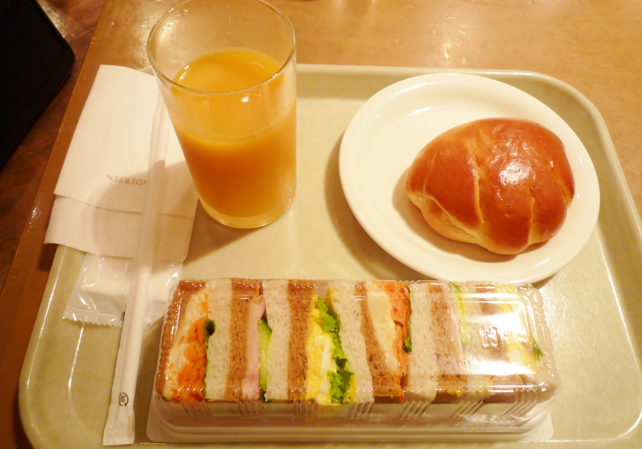 今回は単品でサンドイッチ、クリームパン、オレンジジュースにしました。