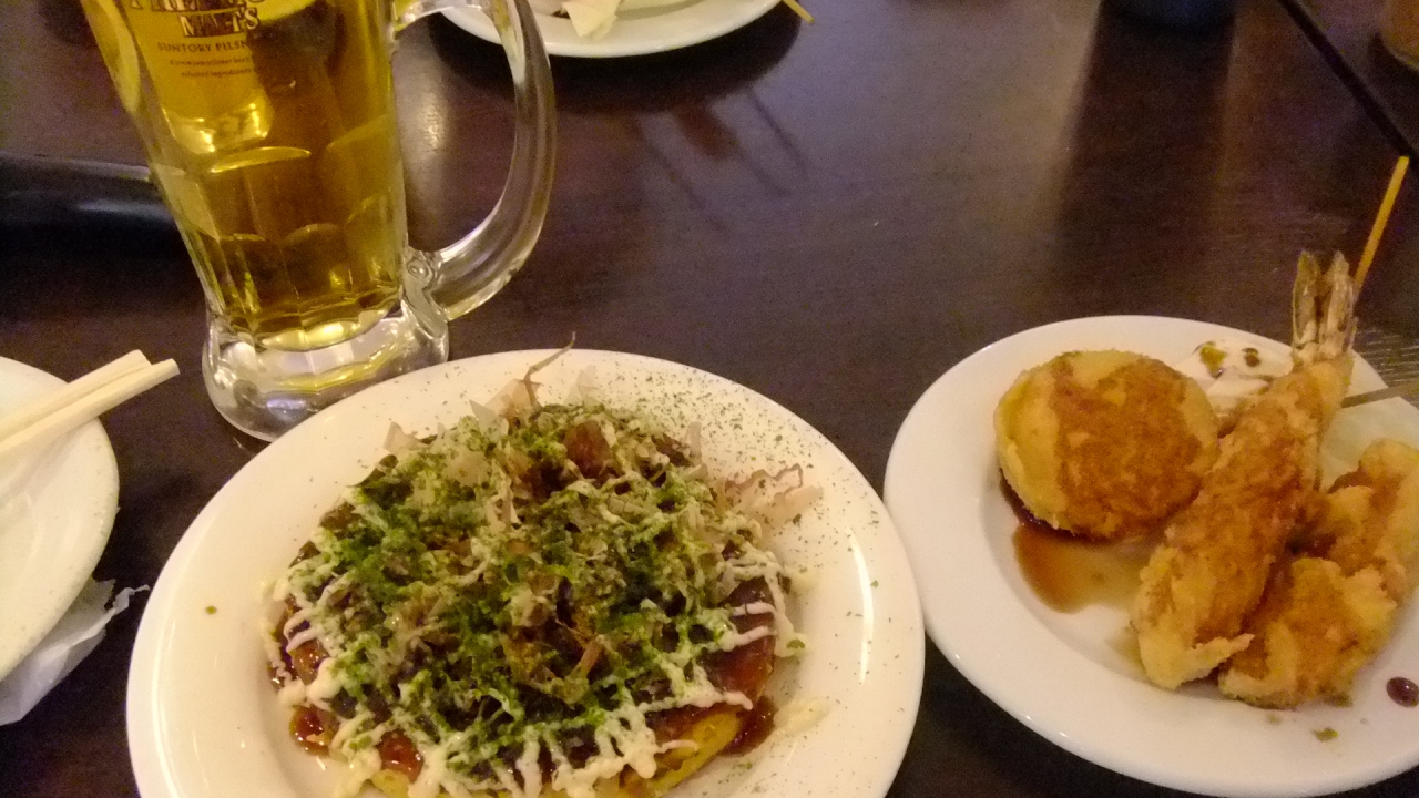 大阪についた最初の日のお昼だったので、とりあえず大阪っぽいものをいろいろ食べたいなと思いました。このお店では「ミニたこ焼き、ミニお好み焼き、串少しと、ドリンクのセット」があるということで、便利なので寄りました。少し値段は高めかな。
