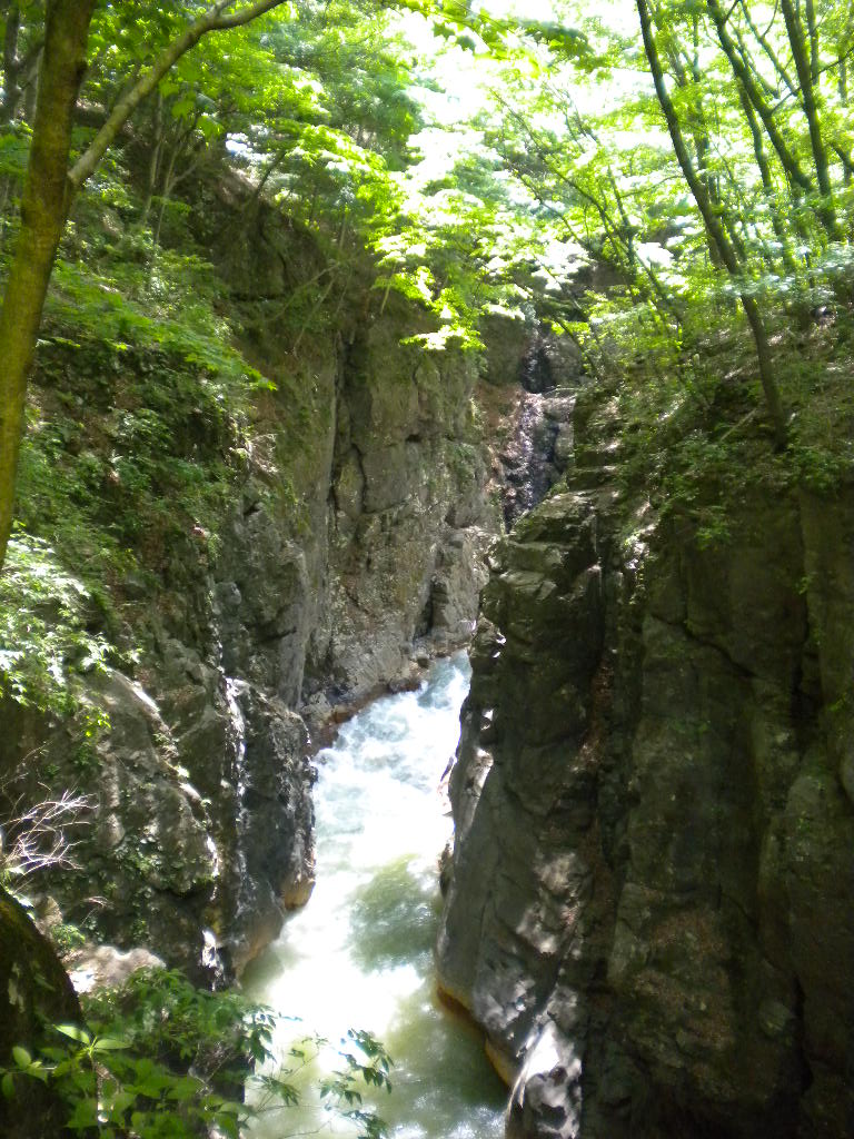 道の駅あがつま峡から車で五分ほどの十二沢パーキングに車を止めて行けるのですが案内板が判りにくくちょっと迷いましたがひとまず登っていくのが正解です ちょっと足元の悪い歩道を下りていくと有りました紅葉も綺麗でしょうが新緑もなかなか良かったです