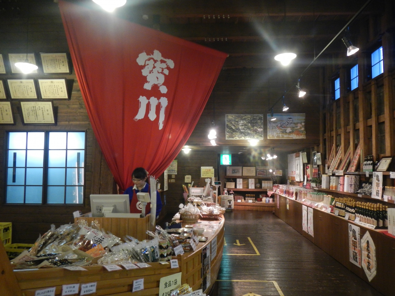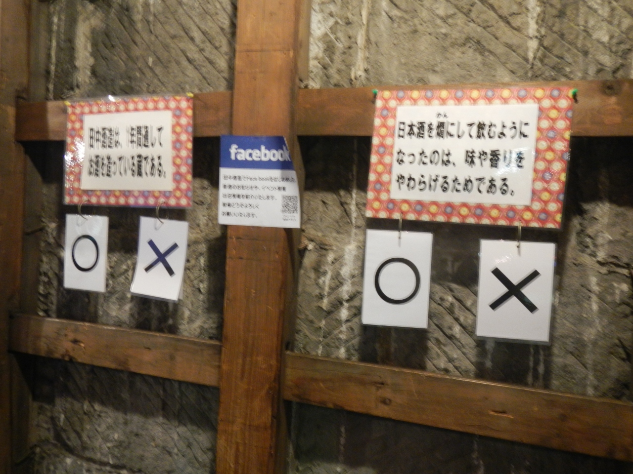 営業時間は6時までだが、到着したのは5時45分ぐらいだったのが、まず2階に上がり、壁に張ってあるクイズを解きながら日本酒の仕込みの過程を見学する。見学が終わると1階に降りて日本酒を試飲する。しぼりたての生原酒や寶川を飲むことができた。