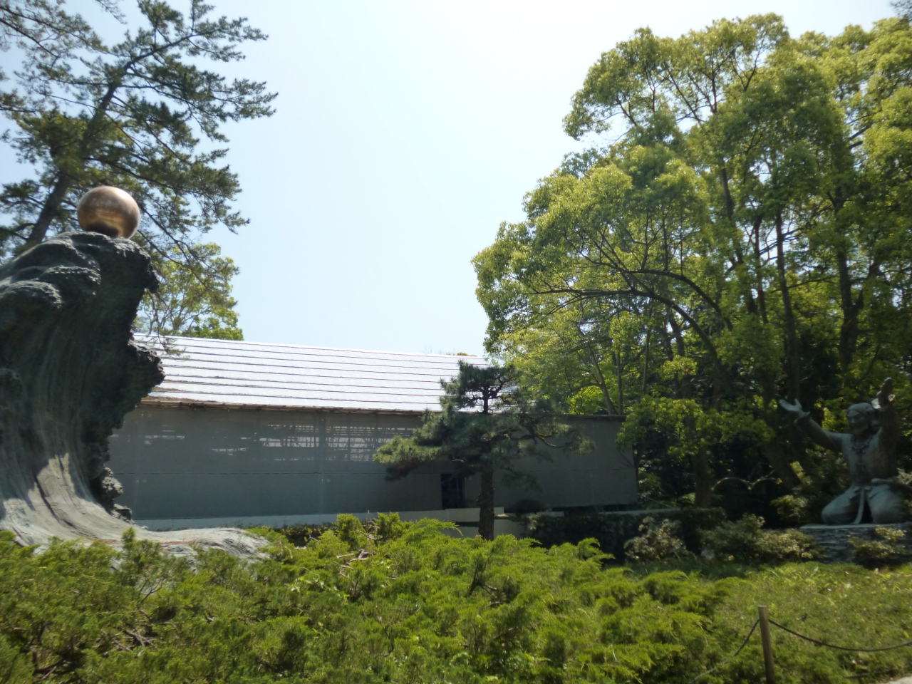 出雲大社の松の参道を抜けたところにあります。左手に水舎があり、右手にあるのがこちらのムズビの御神像です。とても大きな像なので1枚の写真におさめるのが難しいほどでした。像の手前には、像についての説明も書かれていました。