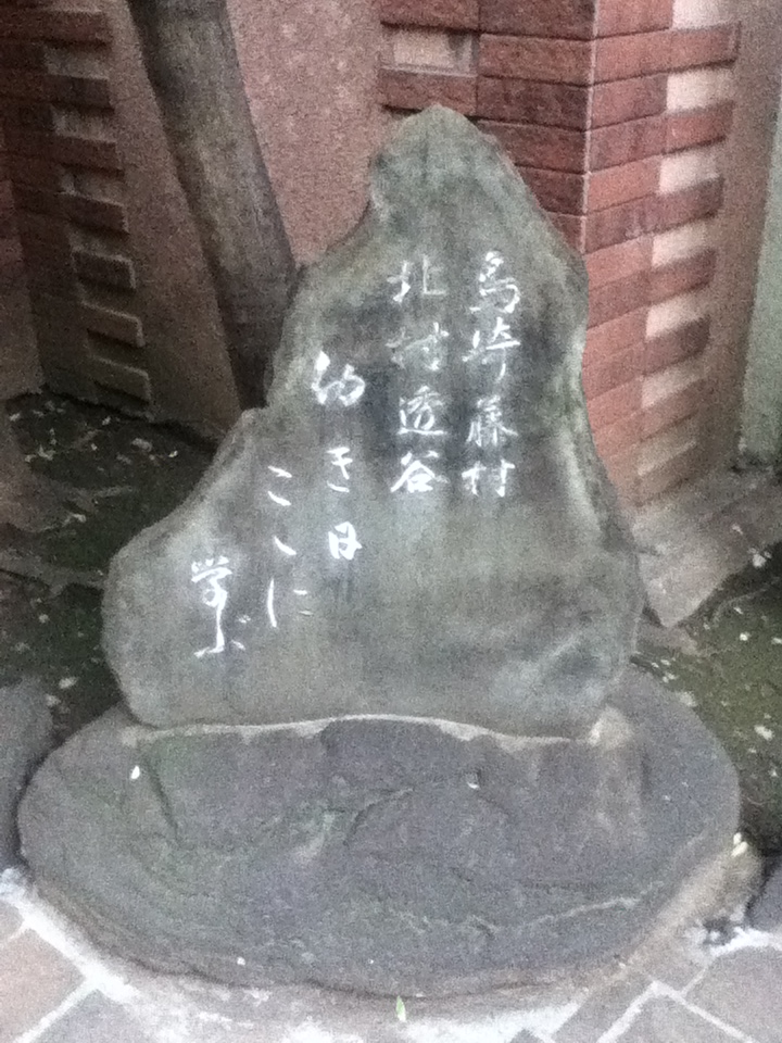 JR有楽町駅の北西、JR線路の南側にある泰明小学校の校舎の入口横に石碑がある。石碑は自然の石をそのまま使ったような形状のもので、字はかなり薄れているが、2人の文字は読み取れる。平日夕方だったせいか、付近には人はほとんど通らず周りは静かであった。石碑のみなので観光要素は少ないが、文豪、島崎藤村と日本の近代浪慢主義の開拓者、北村透谷がこちらの小学校で学んだ。特に藤村や透谷に関心や知識がある方には、訪問することをお勧めする。
