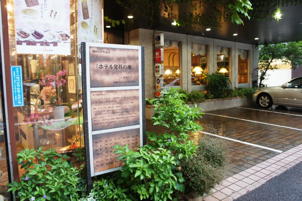 横浜の歴史散歩をしていて少々見つけにくかったのが「ホテル発祥の地」。大桟橋通りのレストラン「横浜かをり」の前にあったのですが、説明パネルは駐車場横の植え込みの中にあって、遠目には見えず通り過ぎるところでした。ここに1860年、オランダ人が日本初の近代ホテルを開業。食堂のほか、ビリヤード場、酒場、洋菓子の販売まで行っていたようです。宿泊客の中にはシーボルトのほかハイネ、クラークなどの名前もあるようです。この一帯は外国人居留地だったようですけど、戦災などを経てまったく別物の町になっているので、だからどうなの?って気もしますけどね。