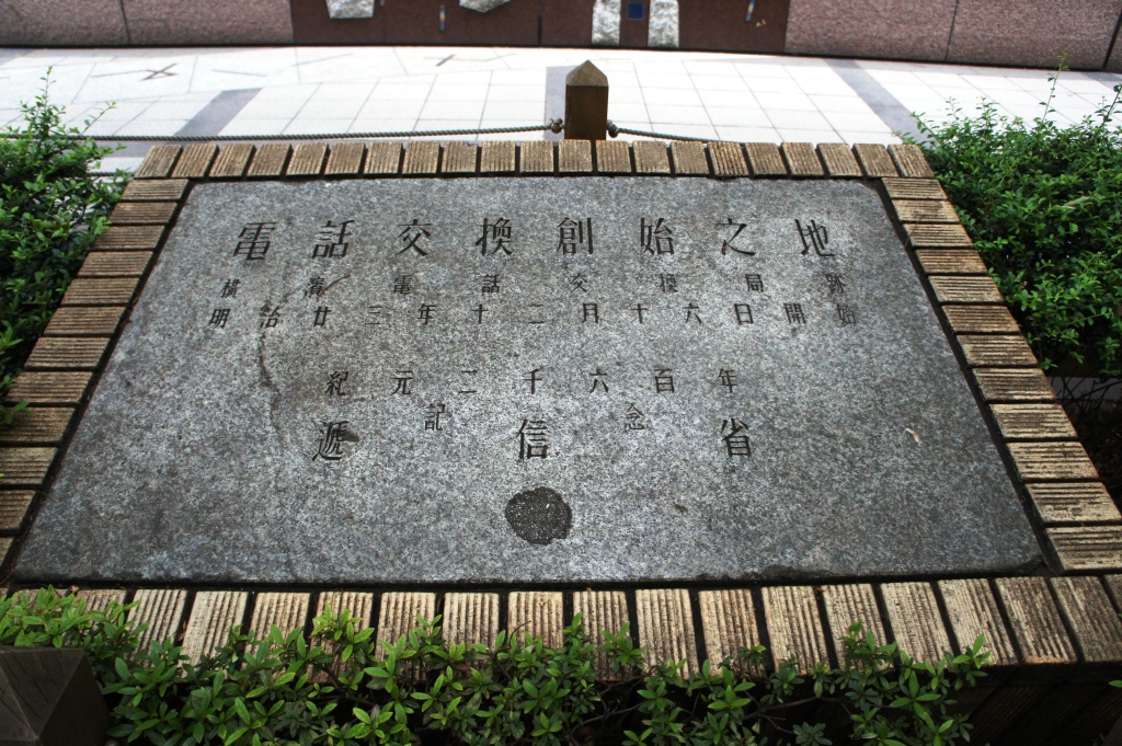明治に入り横浜には全国に先駆けて新しい技術がどんどん入ってきました。その一つが電話。横浜港郵便局前には1890年12月16日、横浜と東京の間で電話交換の業務を開始したことを示す碑が設置されていました。碑文に紀元2600年、逓信省とありますから、碑そのものもかなりの年代物です。そのせいか、字体もかなりオールドファッションです。当時の横浜の加入者は42人、電話交換手は4人だったそうです。