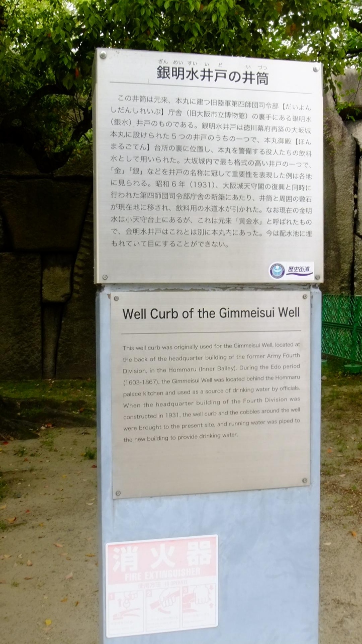 大阪城を訪問した際に、説明板があったので寄ってみました。地味な感じなので、気にしていないと通り過ぎるかもしれません。旧陸軍に関わる井戸のようで、昔は5つあったそうです。その中の本丸御殿付近のものが保存、見学できるようになっています。現在はその井筒が見られるのみ。