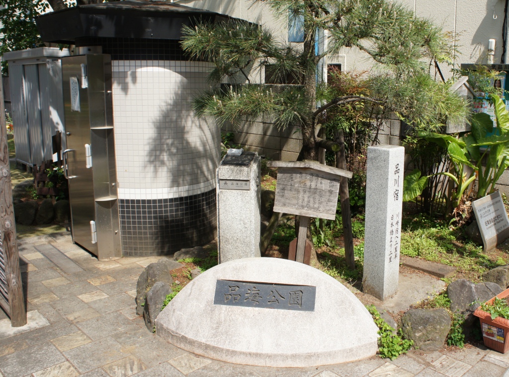 海道五十三次の最初の宿場町として売り出し中の旧品川宿。かつて栄えた宿場地の証しと思われる建物が残っておらず、当時と同じ道幅を除いては、ふつーの商店街としか思えない雰囲気です。そんな思いで散策していると、通り沿いの小さな公園に「品川宿」と書かれた碑を見つけました。公園には品海公園と名がついてました。「一六〇〇軒、人口七〇〇〇人規模で賑わっていた」と書かれた説明板があったほか公衆トイレがあるだけの公園で、何となく観光客用に無理やり作ったのかしらという感もしました。
