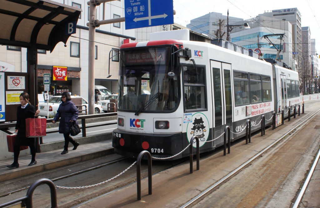 熊本の水前寺成趣園に訪れた際、利用した交通機関はもちろん市電。15分ほどの楽しい電車の旅を楽しみました。それほど幅員があるとはいえない熊本市中心部。電車が走ることで、車の通行は少々、つらそうです。一観光客にはあまり関係ないけど。乗車したのは繁華街とお城の間にある辛島町でした。土曜の午後とあってほぼ満席です。路面電車は広島、長崎、松山でさんざん乗っていることもあって我ながら慣れたもの。へたすりゃ数十メートルおきに停車するのもよくあることです。びっくりしたのは、水前寺公園駅手前の走り方。国府駅から電停がないためか、路面電車では経験したことがないようなスピードでした。中心部の辛島町から通町筋にかけて、ほとんど進まず30分は覚悟していましたが、あっという間に取り返してしまいました。
