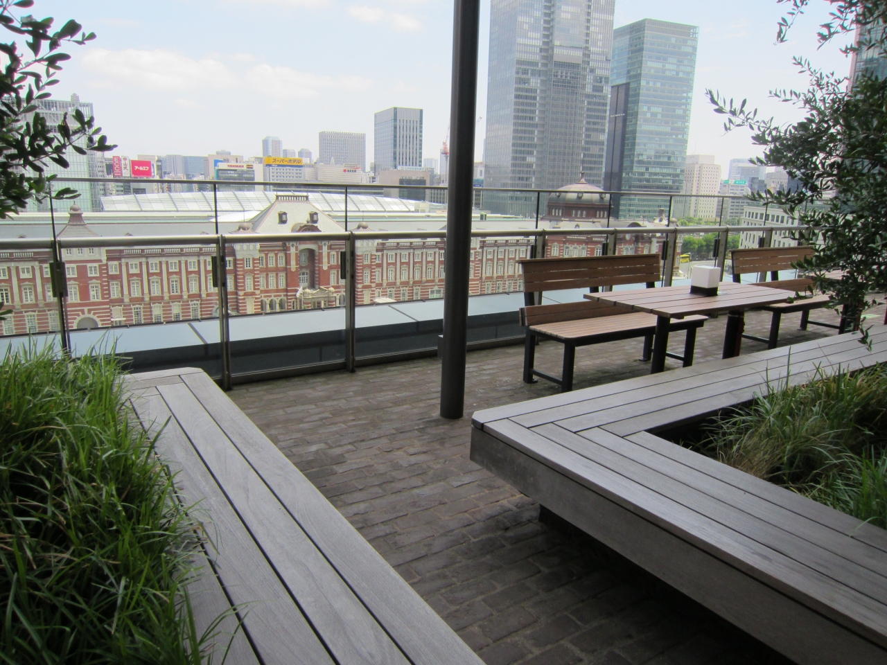 テイクアウトのできるレストランで、飲み物を買って、7階テラスに行きました。屋外に出ると、風が気持ちよかったです。平日は、観光客がだれもいなくて、レトロな東京駅を、上から眺めながら、木陰でのんびり休憩することができました。
