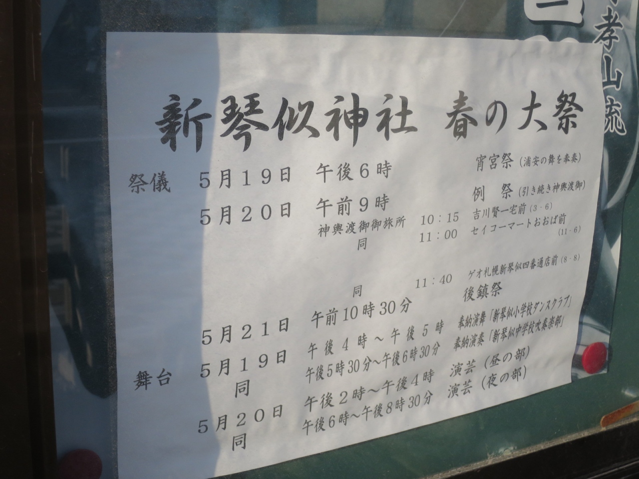5月20日に例祭(春の大祭)があります。19日と20日には境内の舞台で演芸なども行われました。19日は宵宮祭とのことで、舞の奉奏があるとのことですが、本殿の中で関係者のみで行われていました。