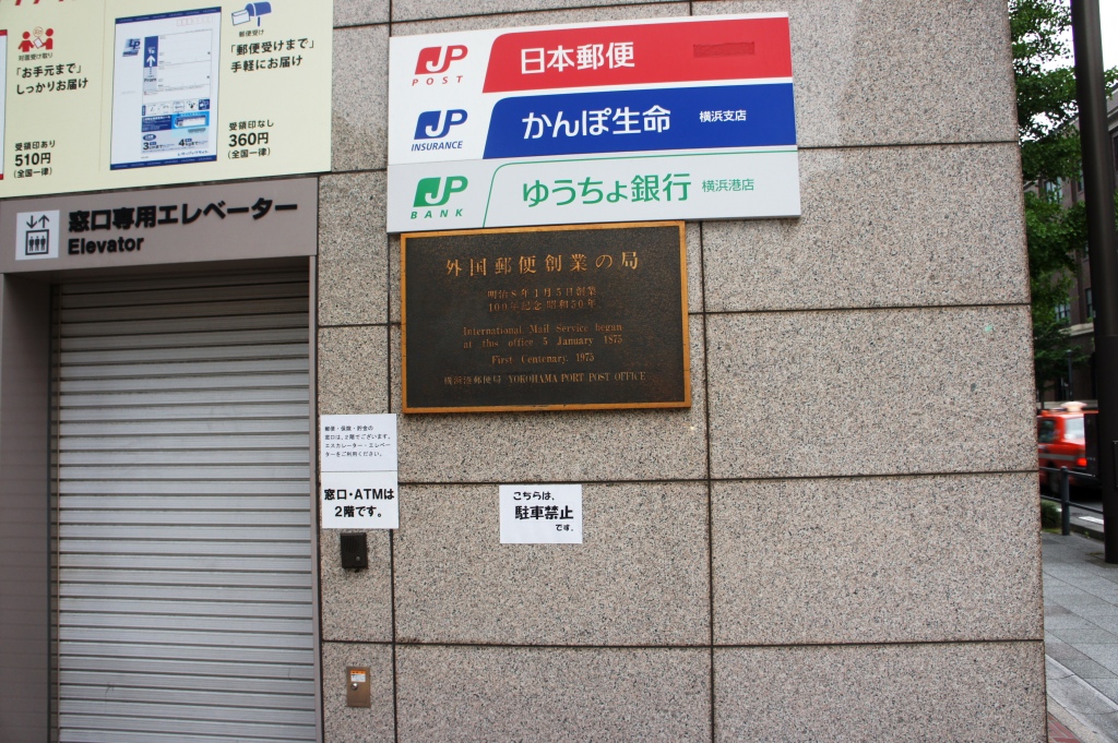 幕末に外国人居留地があったため、日本初といううたい文句がつくことが多い港ヨコハマ。外国郵便を取り扱うようになったのも横浜が最初で、そのことを示すパネルが横浜港郵便局の1階外側に張り付けられてました。1875年、それまでアメリカ郵便局が行っていた業務が移管されたのだそうです。とはいうものの、シンプルすぎるこのパネル。ピンとはきませんよねえ。