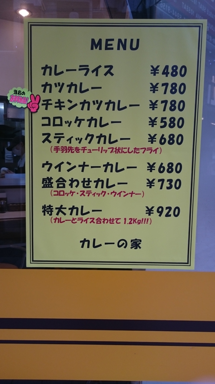 池袋西口のカウンターだけのお店。カレールーにはこだわっていて、オーブンで焼き上げた自家製ルーを使用。その場で煮込んでいる。揚げ物もその場で揚げるのでサクサクしている。特大カレーが920円で1.5キロ。一度挑戦してみたい。らっきょうが無料だともっと嬉しい。カレールーは口のなかで香ばしさが広がり、後から辛さが来るタイプ。どことなく昔、食べた気がする懐かしい味。ウインナーも衣で揚げている。チキンスティックという、いわゆるチキンチューリップを揚げたもので、肉が柔らかい。次回来店時用のコロッケトッピングかサラダの無料券がもらえます。